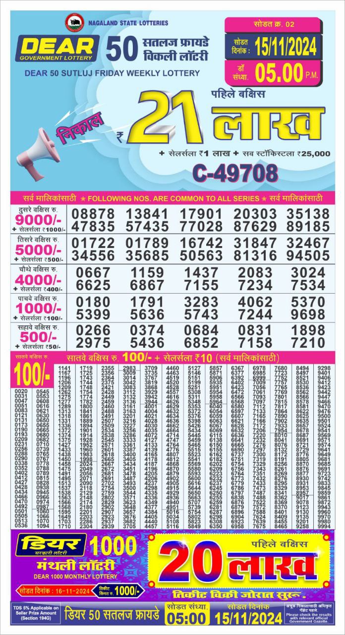 Dear 50 satluj Friday  Lottery 5pm Result  15.11.24