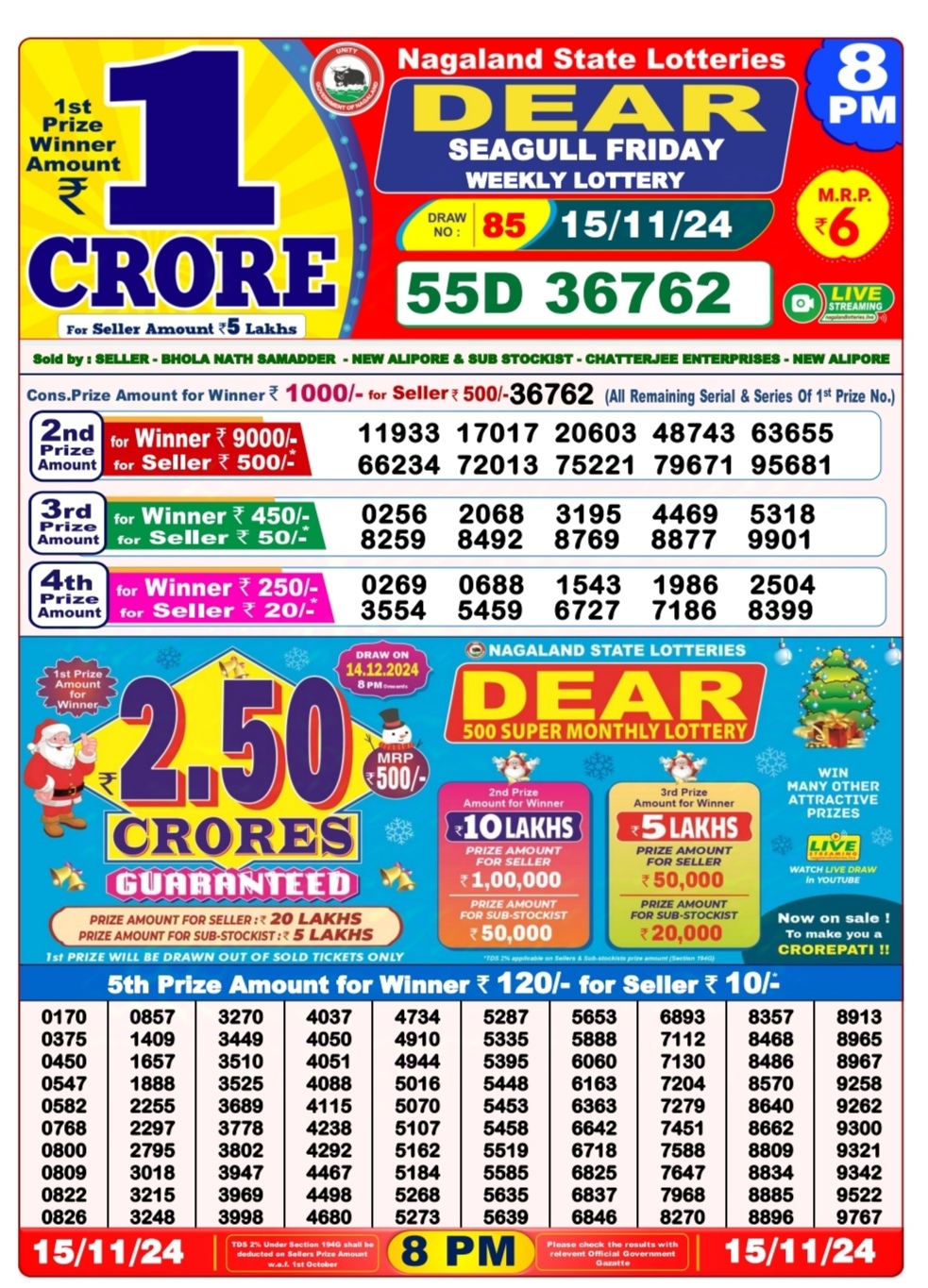 Dear seagull Weekly Lottery 8PM Result 15.11.24