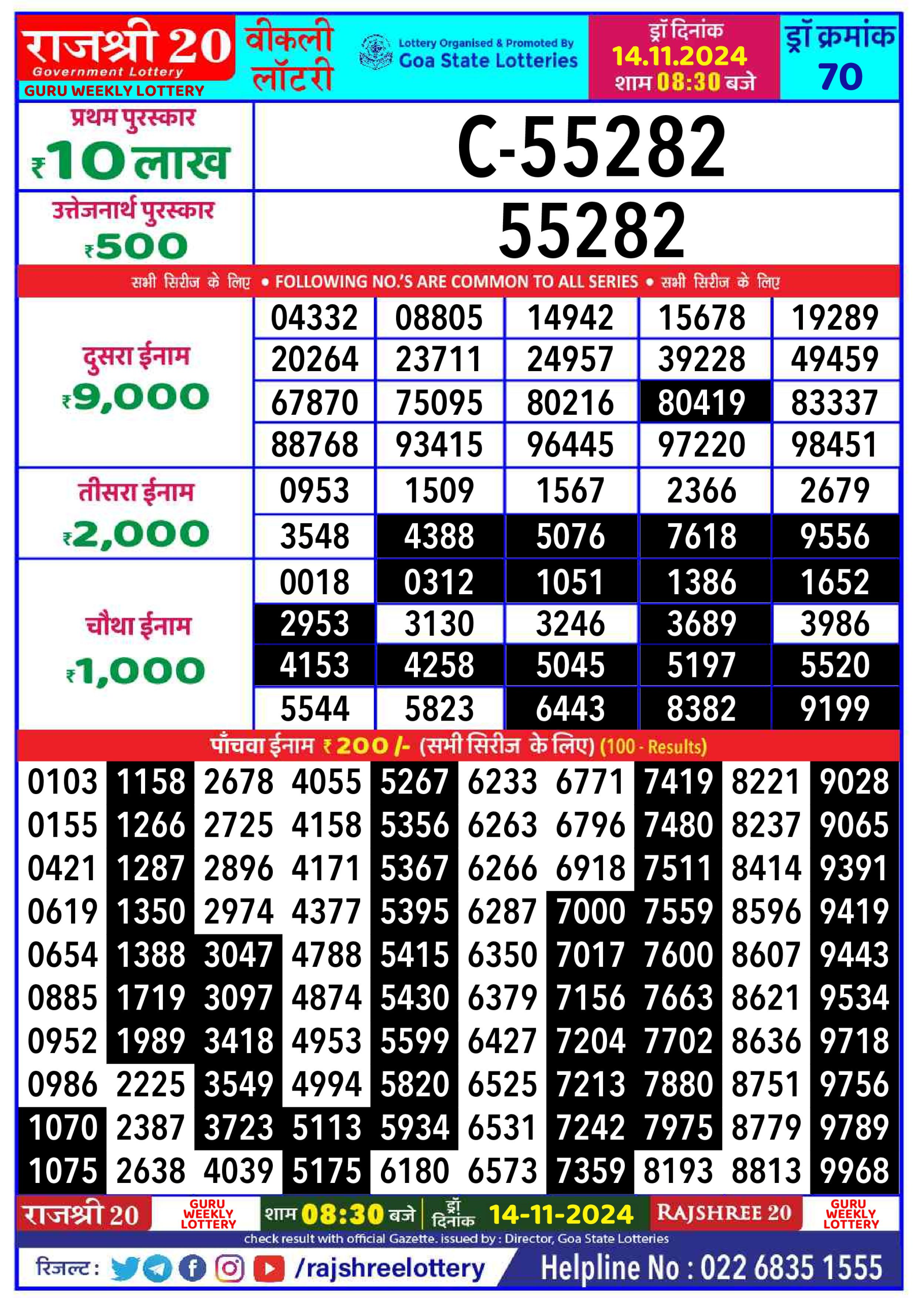 Rajshree 20 Monthly Lottery Result 6:30PM 14.11.2024