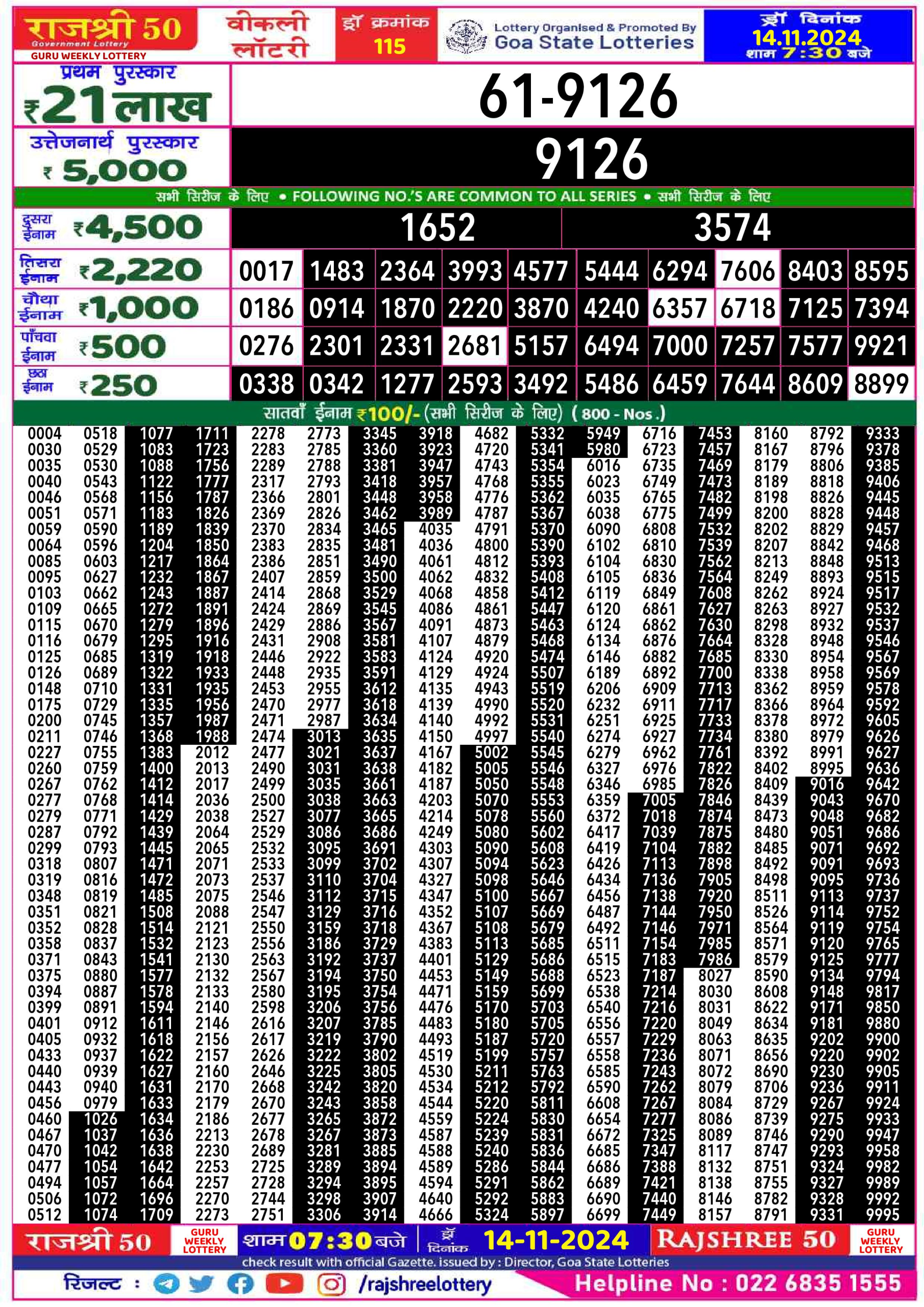 Rajshree 50  Lottery 7:30PM Result 14.11.24