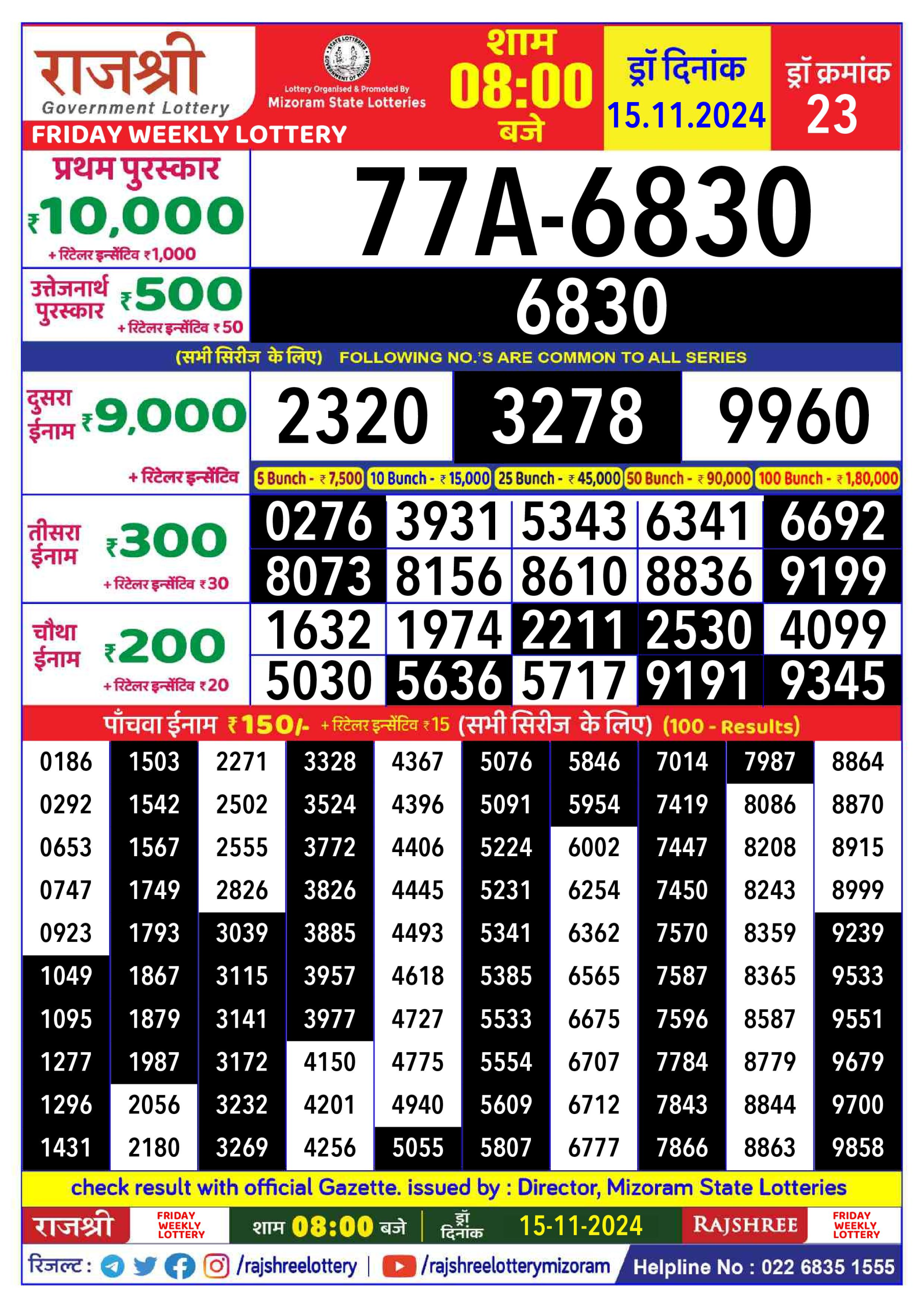 Rajshree  Weekly Lottery 8PM Result 15.11.24