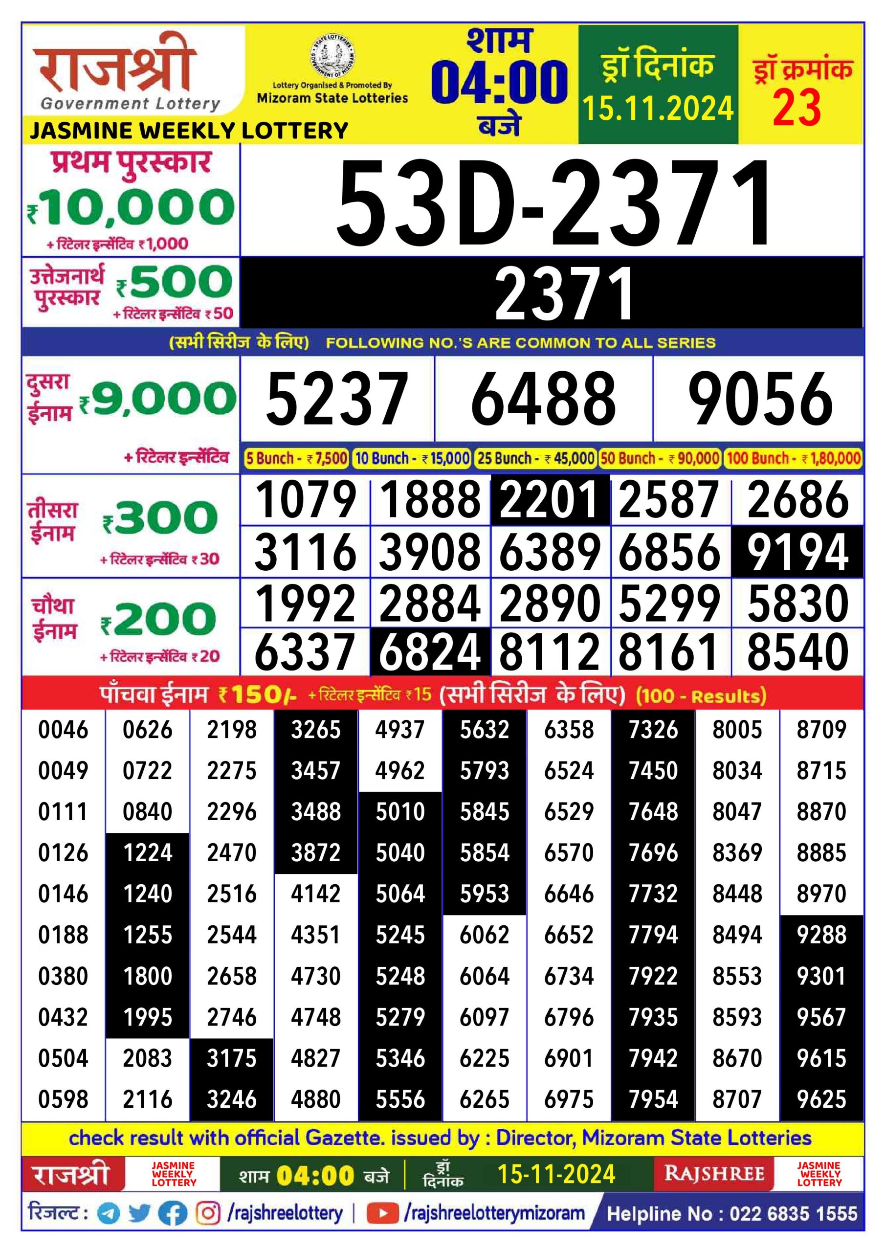 Rajshree jasmine tuesday  Weekly Lottery 4PM Result 15.11.24