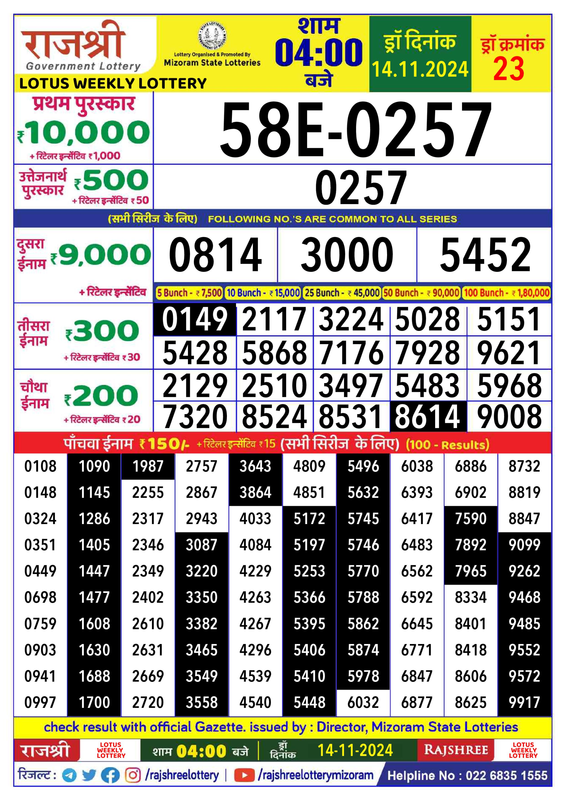 Rajshree lotus tuesday  Weekly Lottery 4PM Result 14.11.24