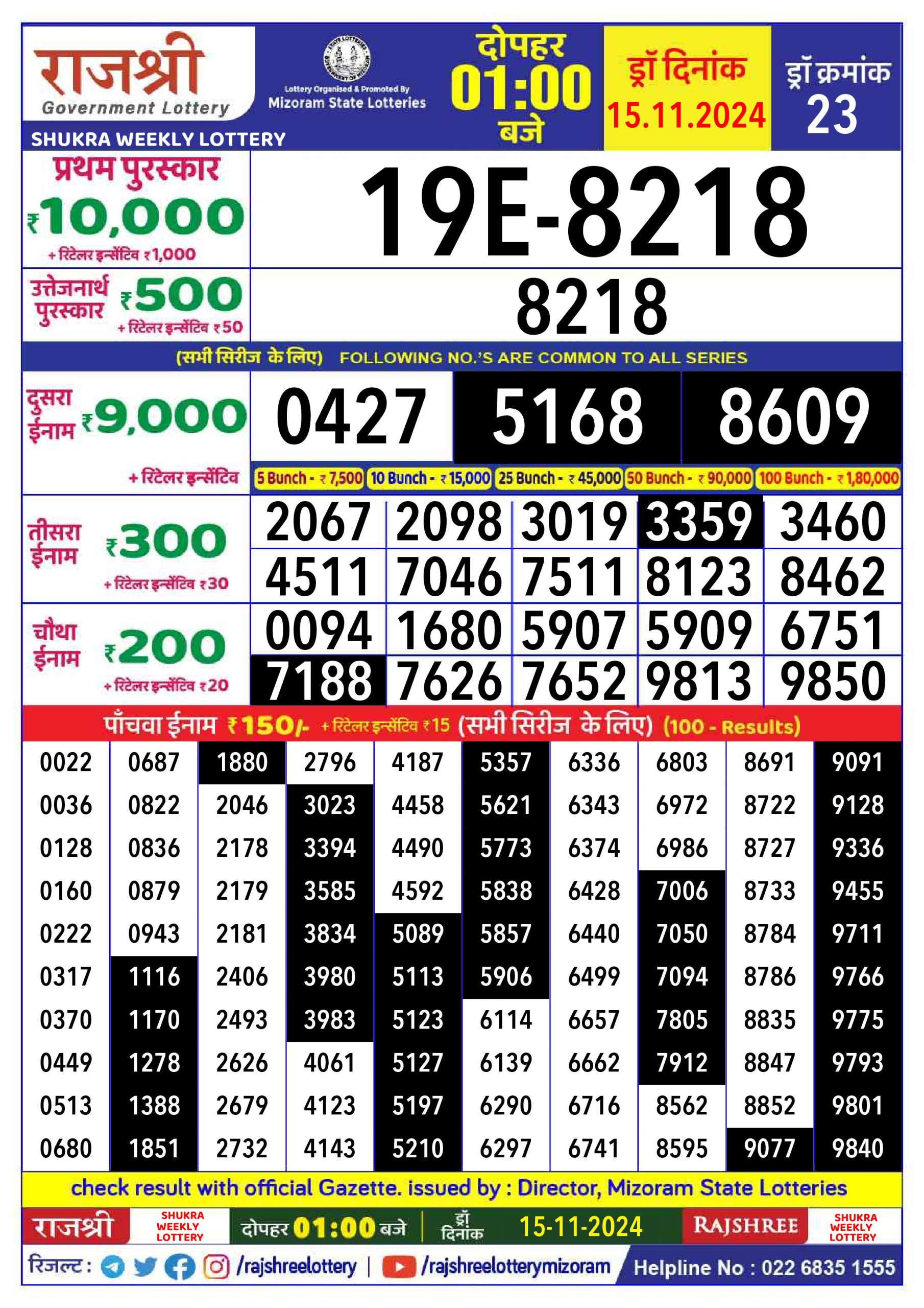 Rajshree shukra Weekly Lottery 1PM Result 15.11.24