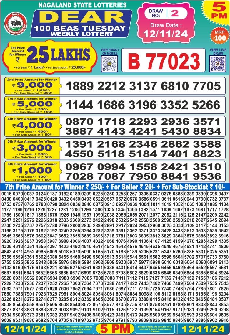 Dear 100 beas tuesday  Lottery 5pm Result  12.11.2024