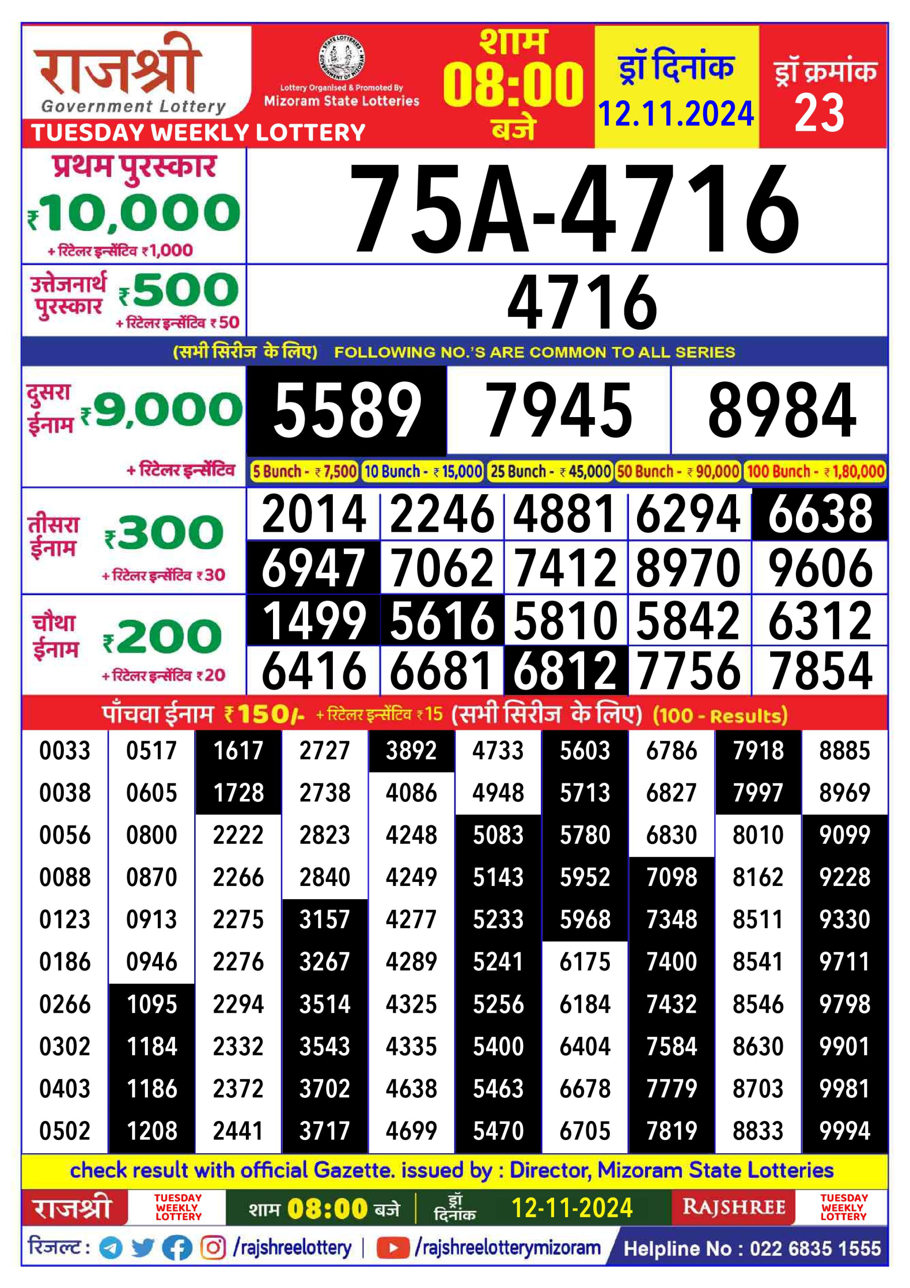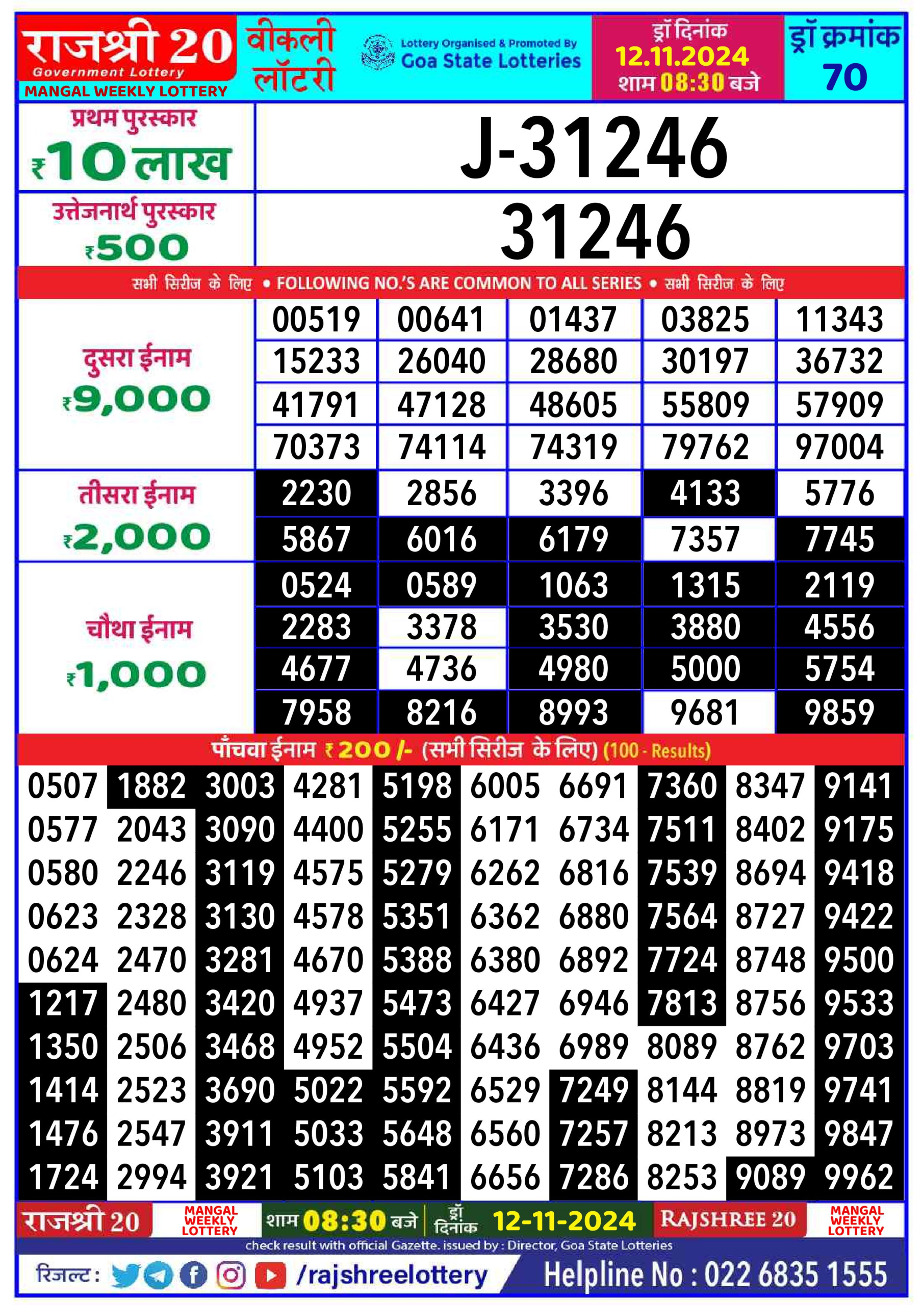 Rajshree 20  weekly 8:30pm Lottery result 12.11.24