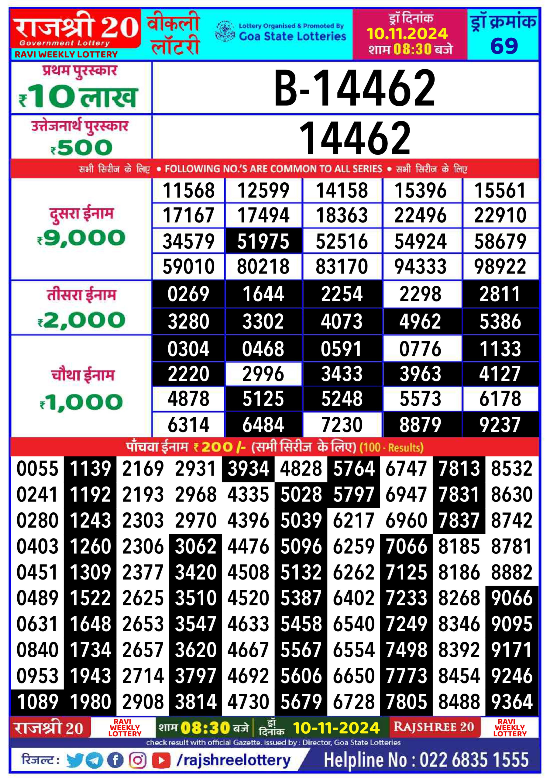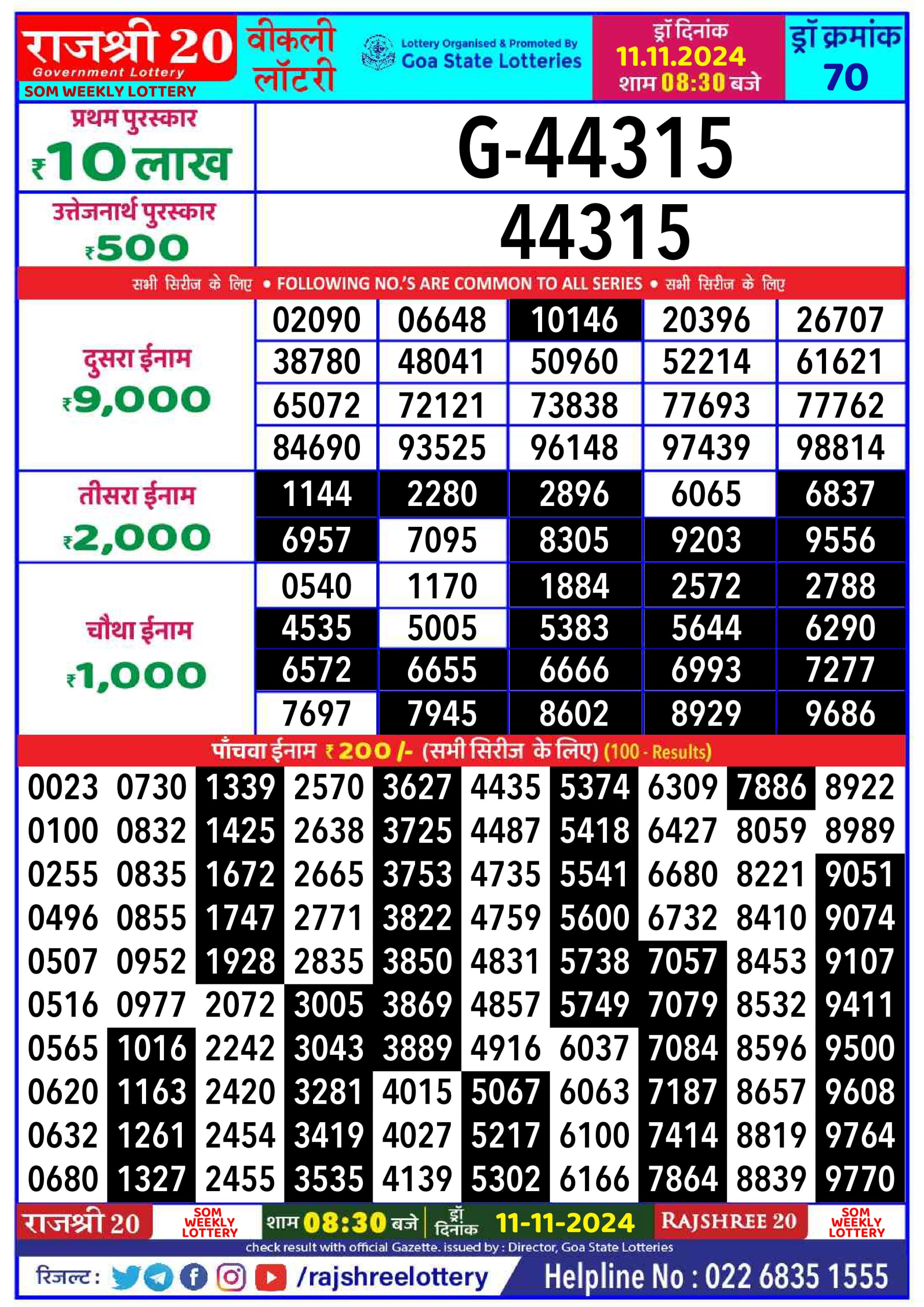 Rajshree 20  weekly 8:30pm Lottery result 10.11.24