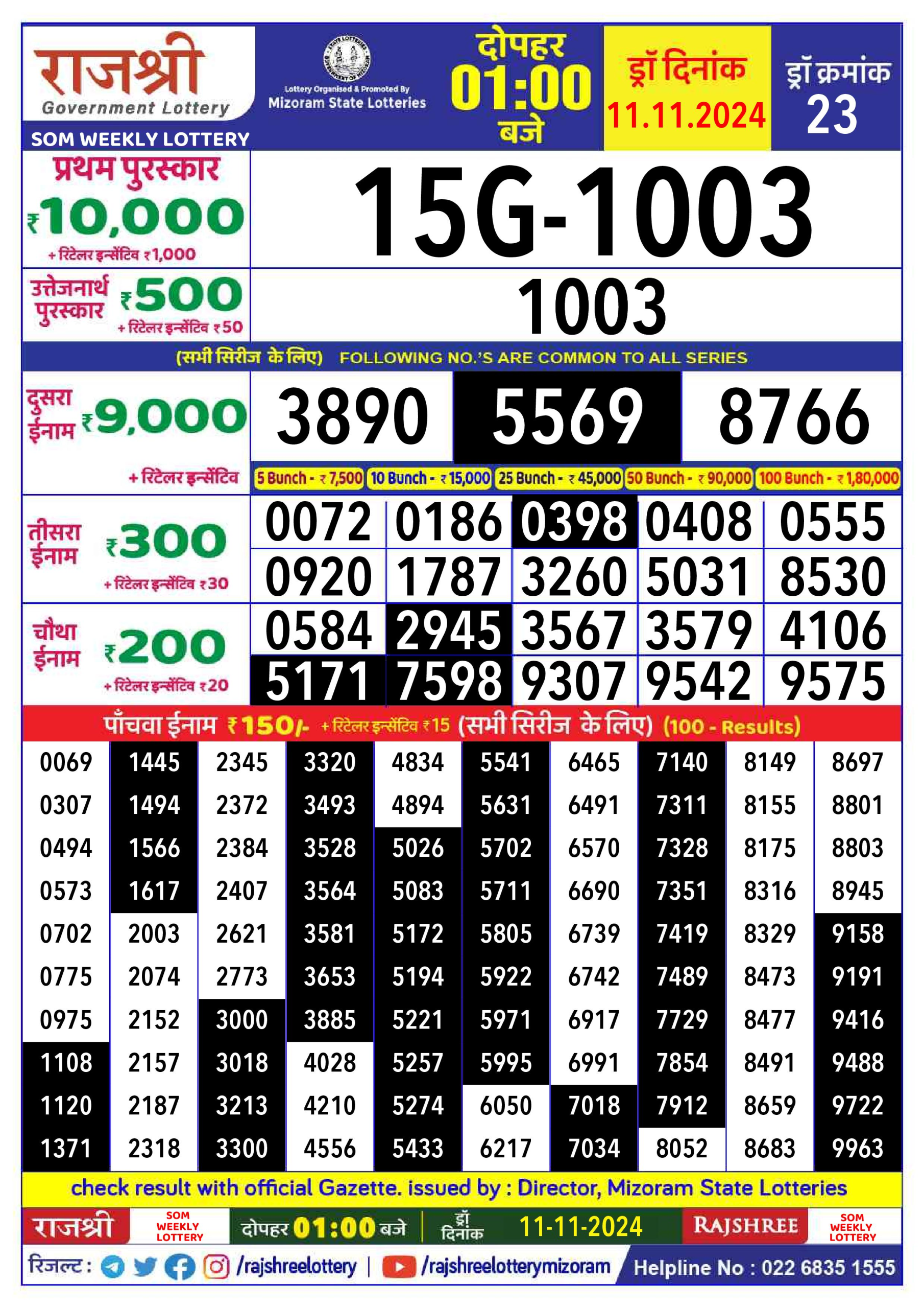 Rajshree som monday Weekly Lottery 1PM Result 11.11.24