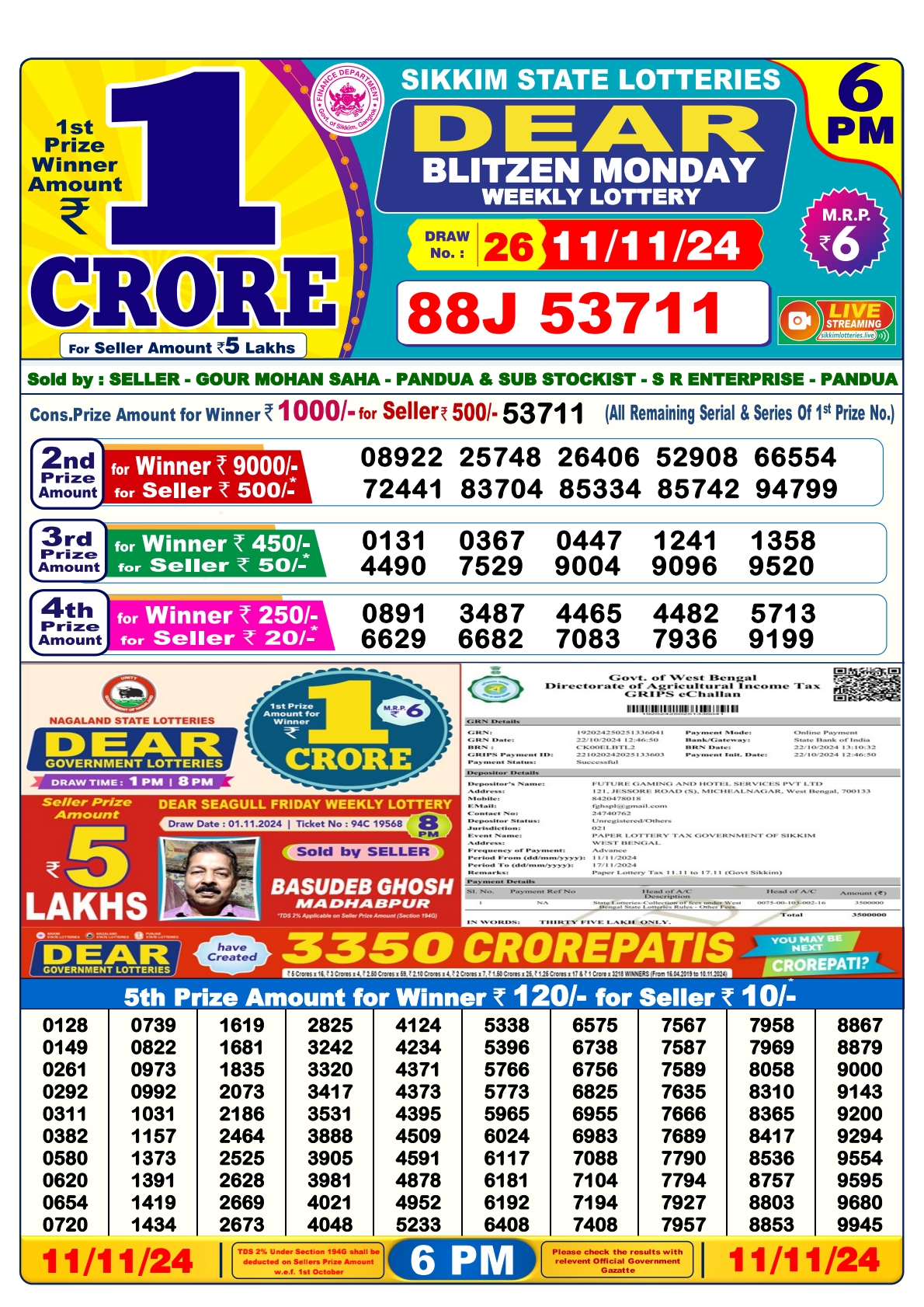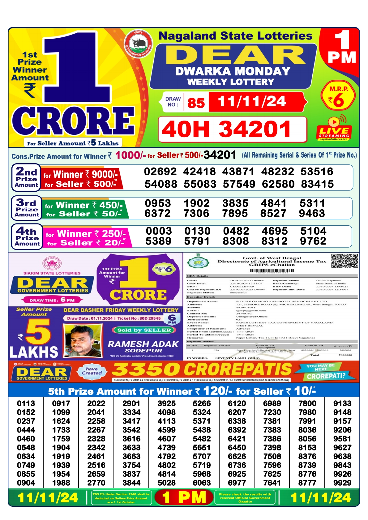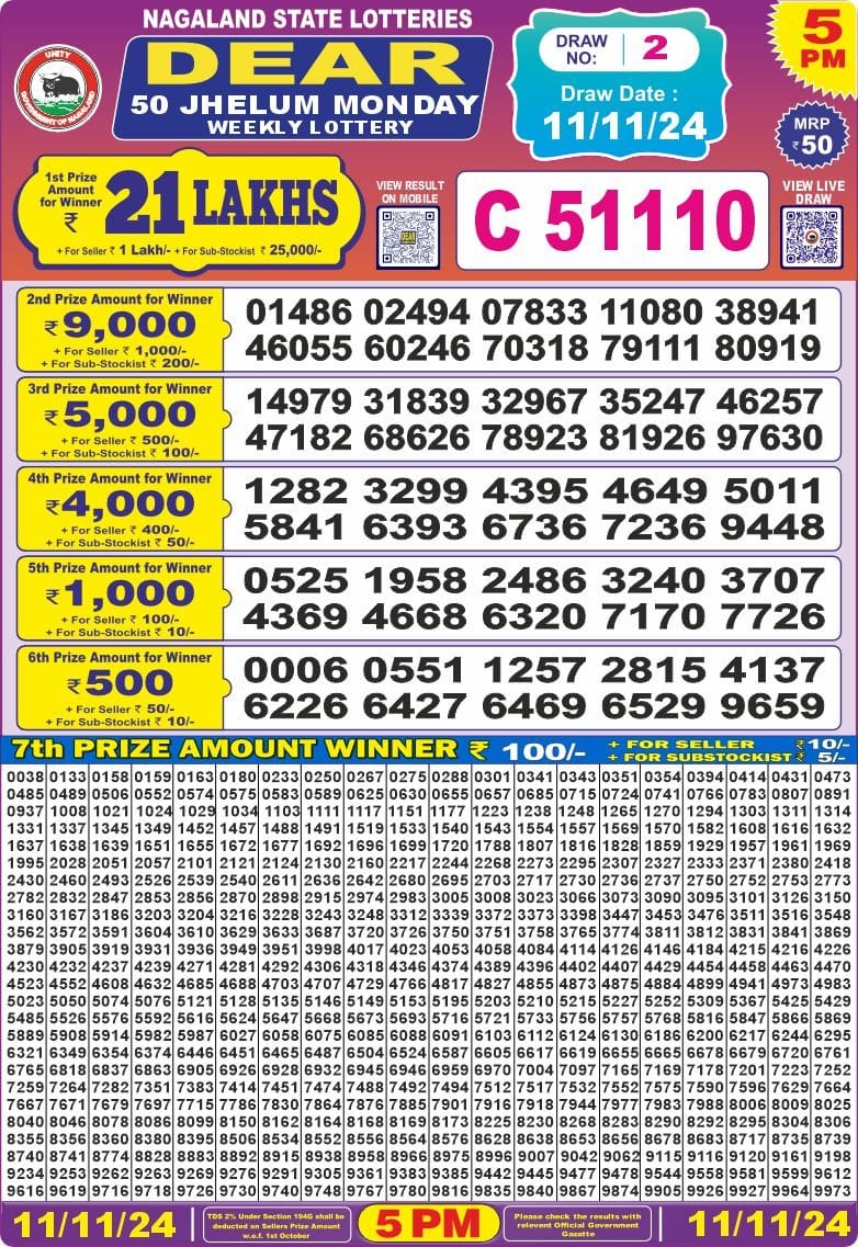 Dear 50 jhelum monday  Lottery 5pm Result  11.11.2024