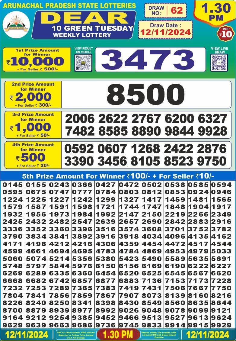 Dear 10 green lottery 1.30PM Result 12/11/24