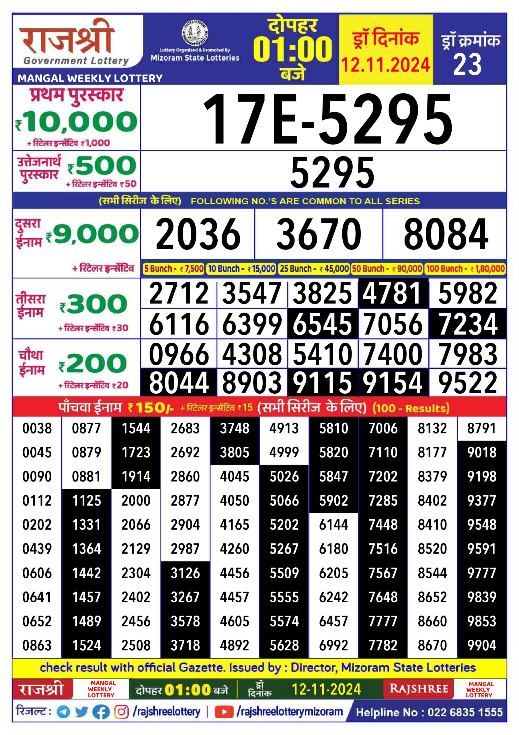 Rajshree Mangal tuesday Weekly Lottery 1PM Result 12.11.24