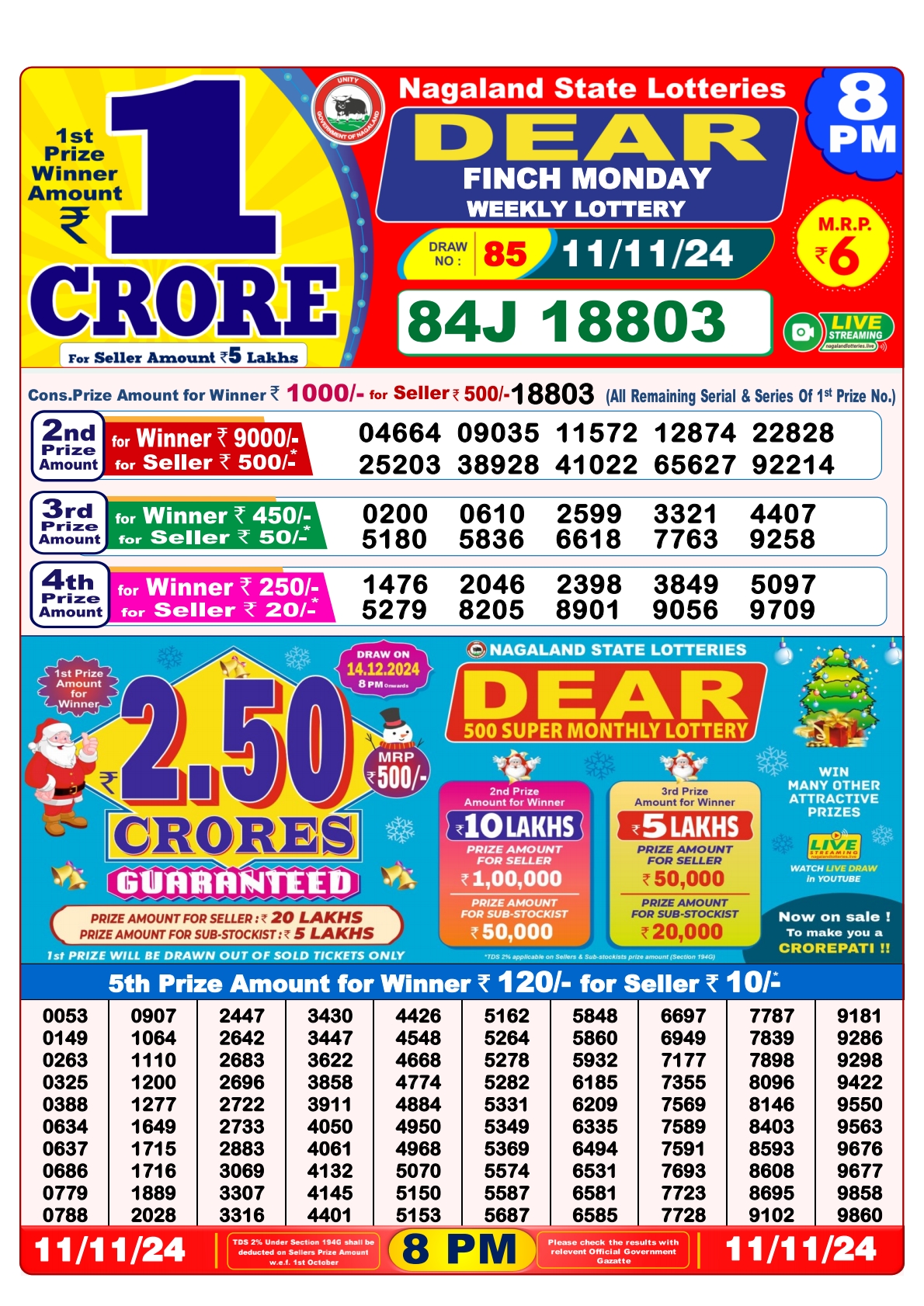 Dear finch Weekly Lottery 8PM Result 11.11.24