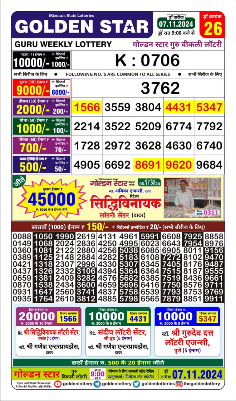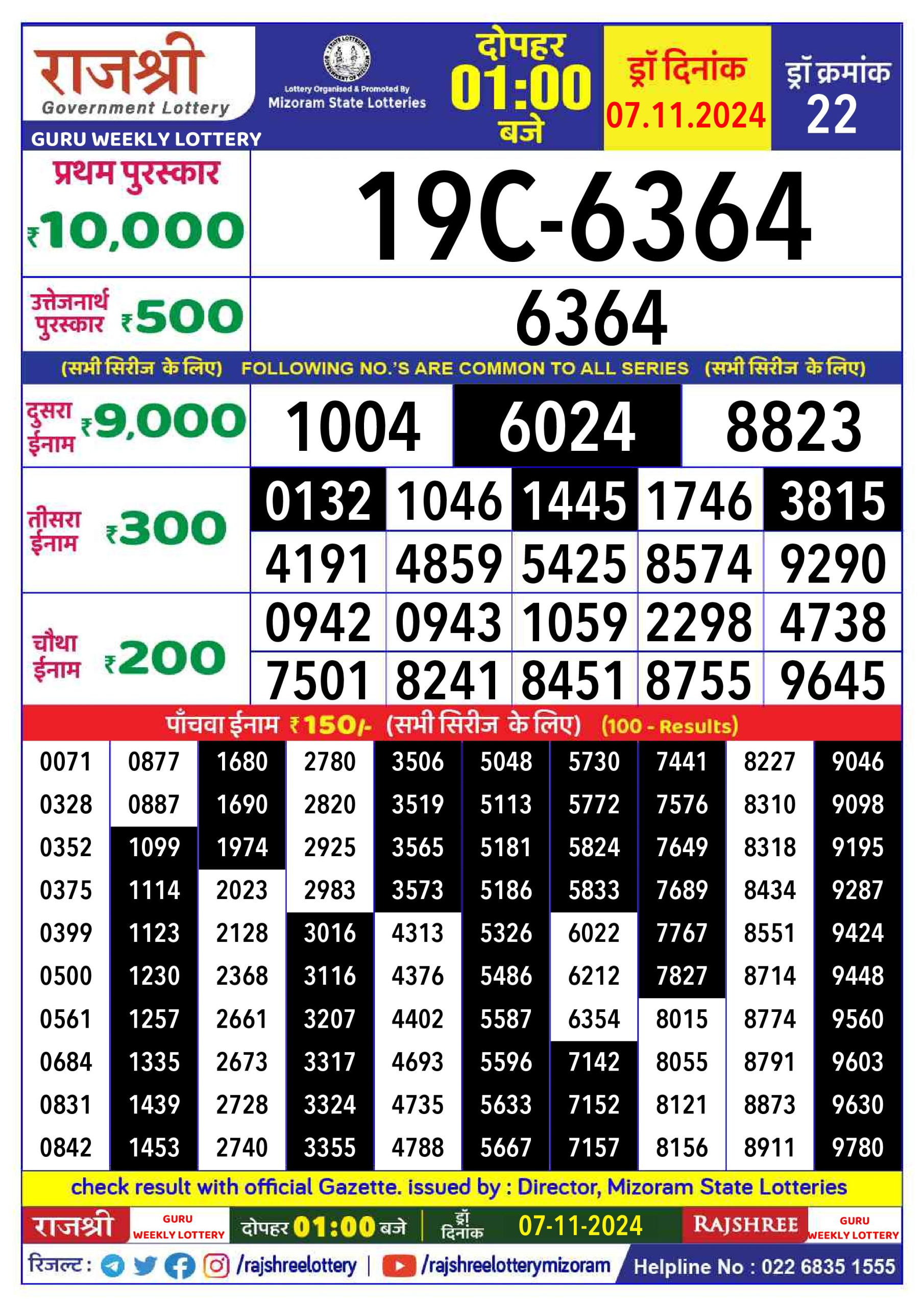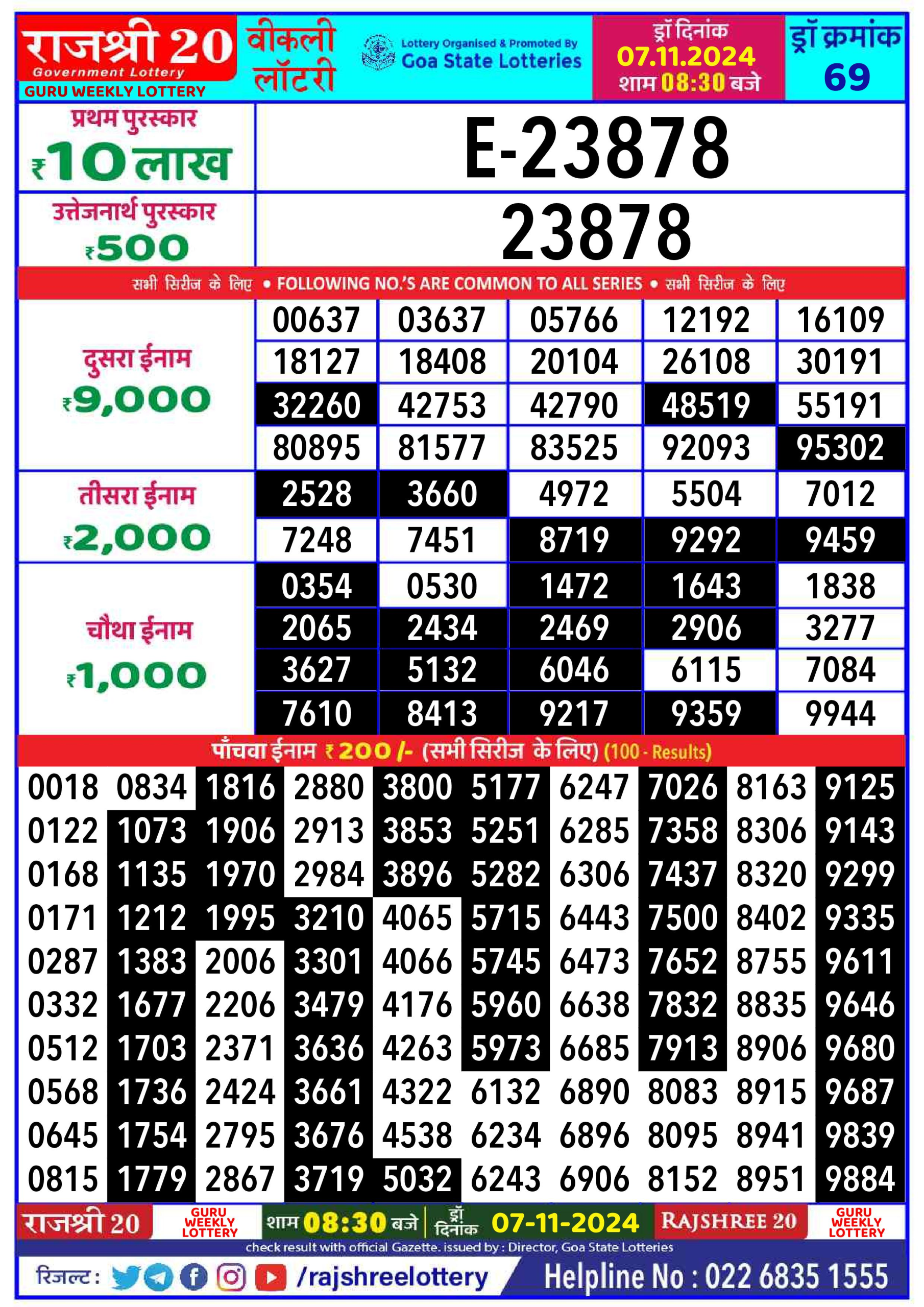 Rajshree guru thursday Weekly Lottery 1PM Result 7.11.24