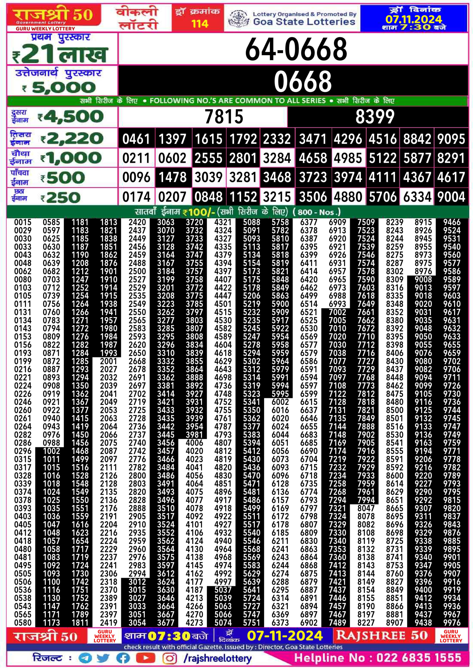 Rajshree 50  Lottery 7:30PM Result 7.11.24