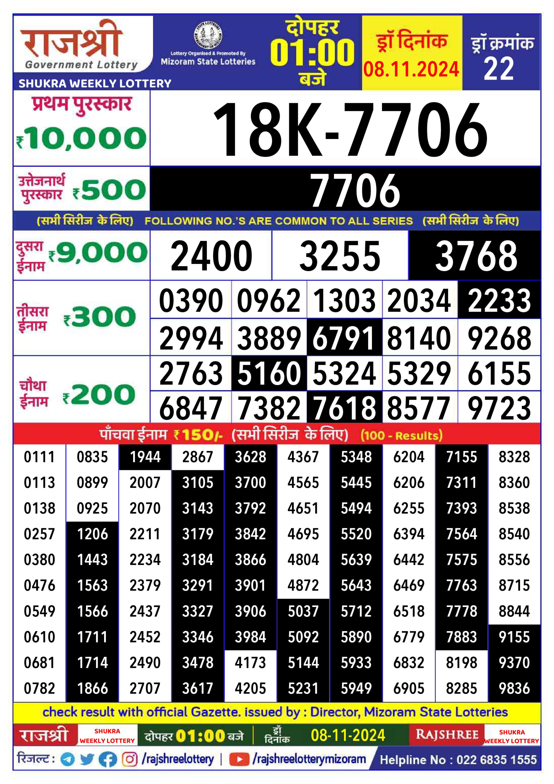 Rajshree shukra friday Weekly Lottery 1PM Result 8.11.24