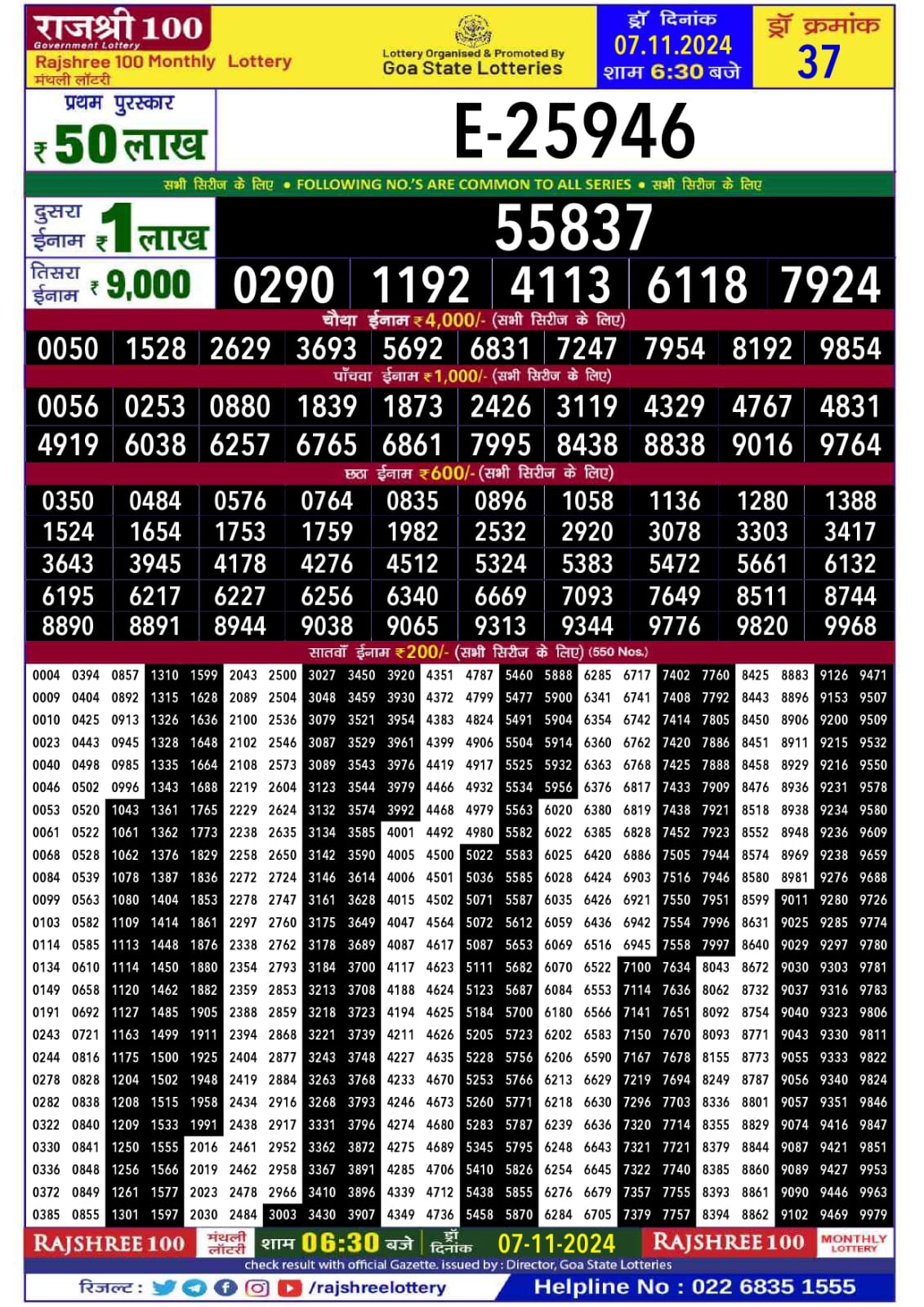 Rajshree 100 Monthly Lottery Result Today 7 November 2024