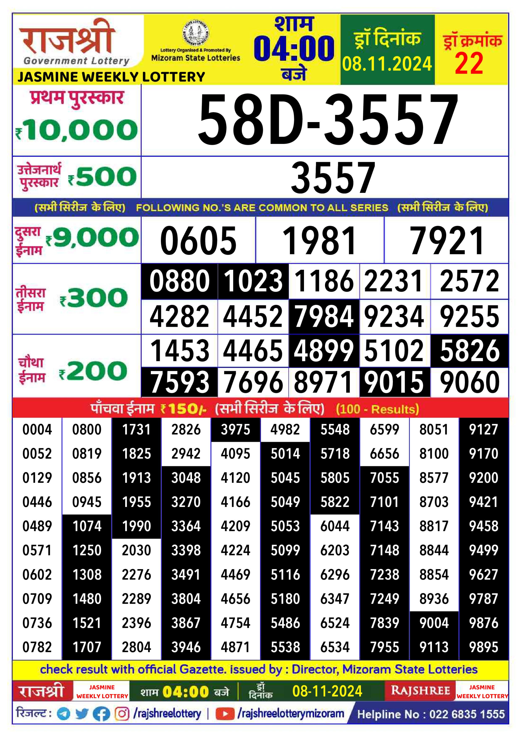 Rajshree jasmine friday  Weekly Lottery 4PM Result 8.11.24