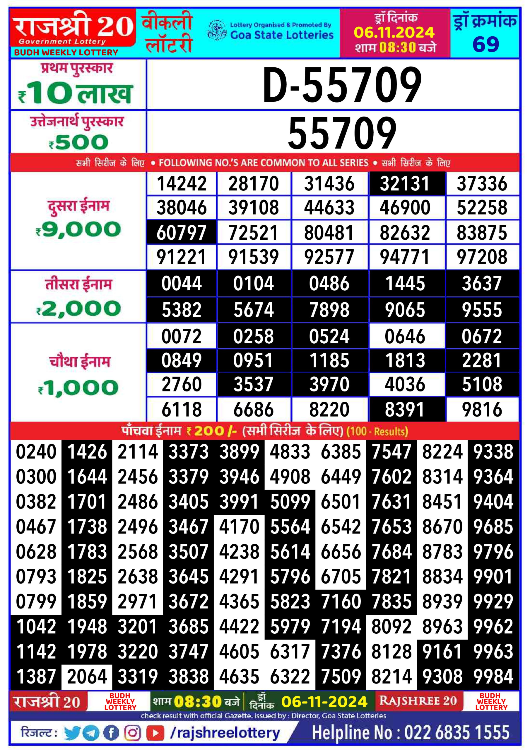 Rajshree 20  weekly 8:30pm Lottery result 6.11.24
