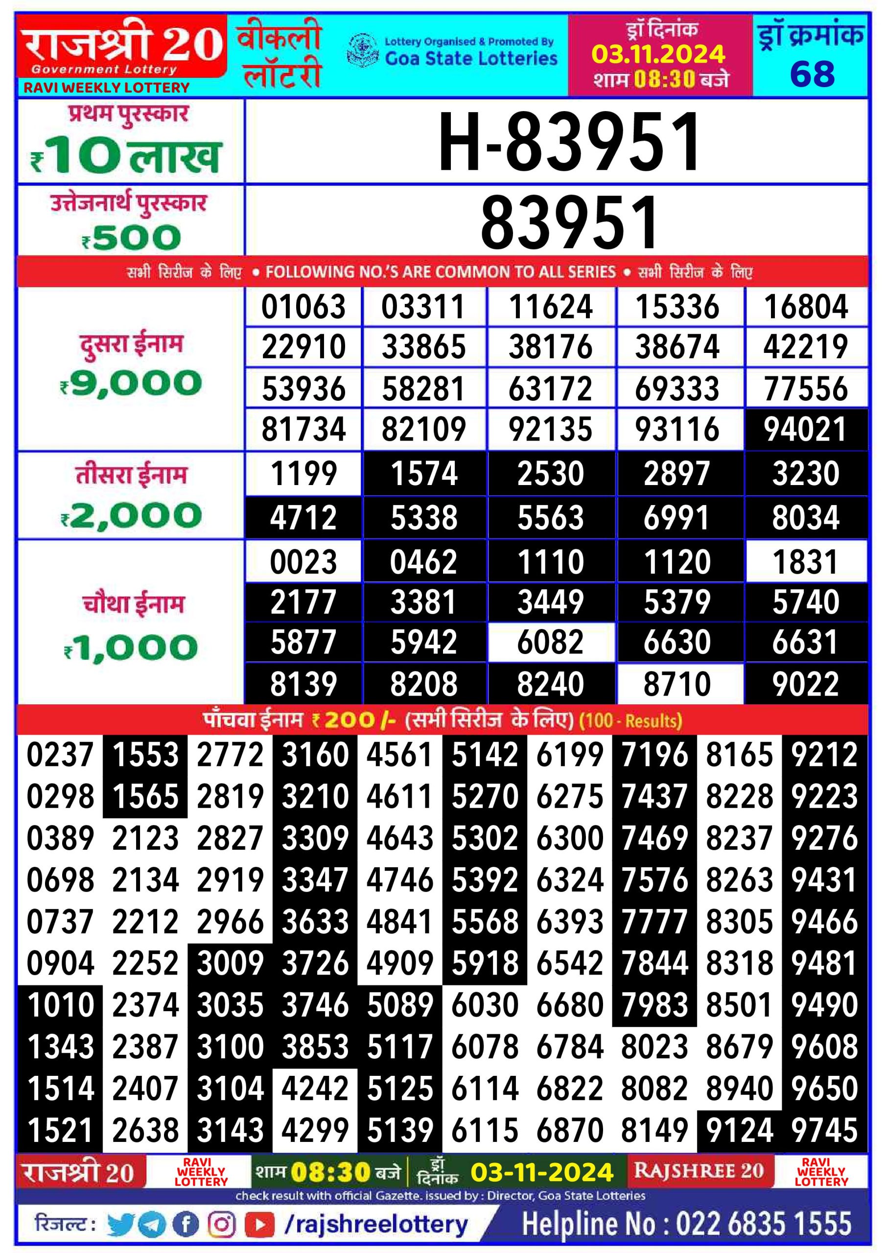 Rajshree 20  weekly 8:30pm Lottery result 3.11.24