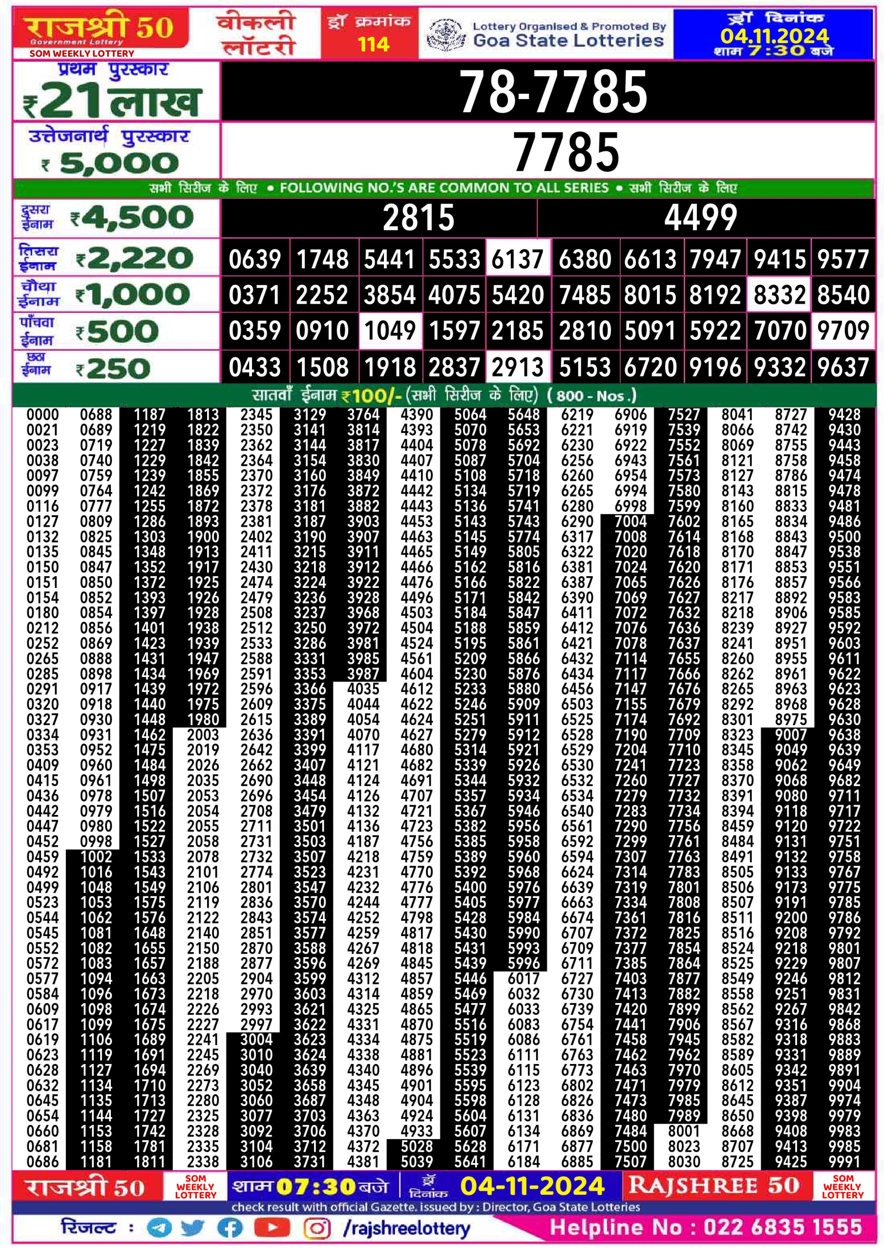 Rajshree 50  Lottery 7:30PM Result 4.11.24