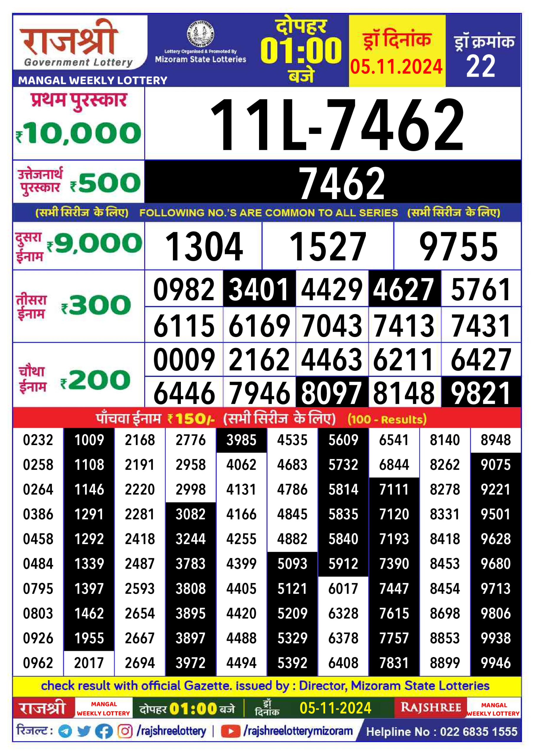 Rajshree Mangal tuesday Weekly Lottery 1PM Result 5.11.24