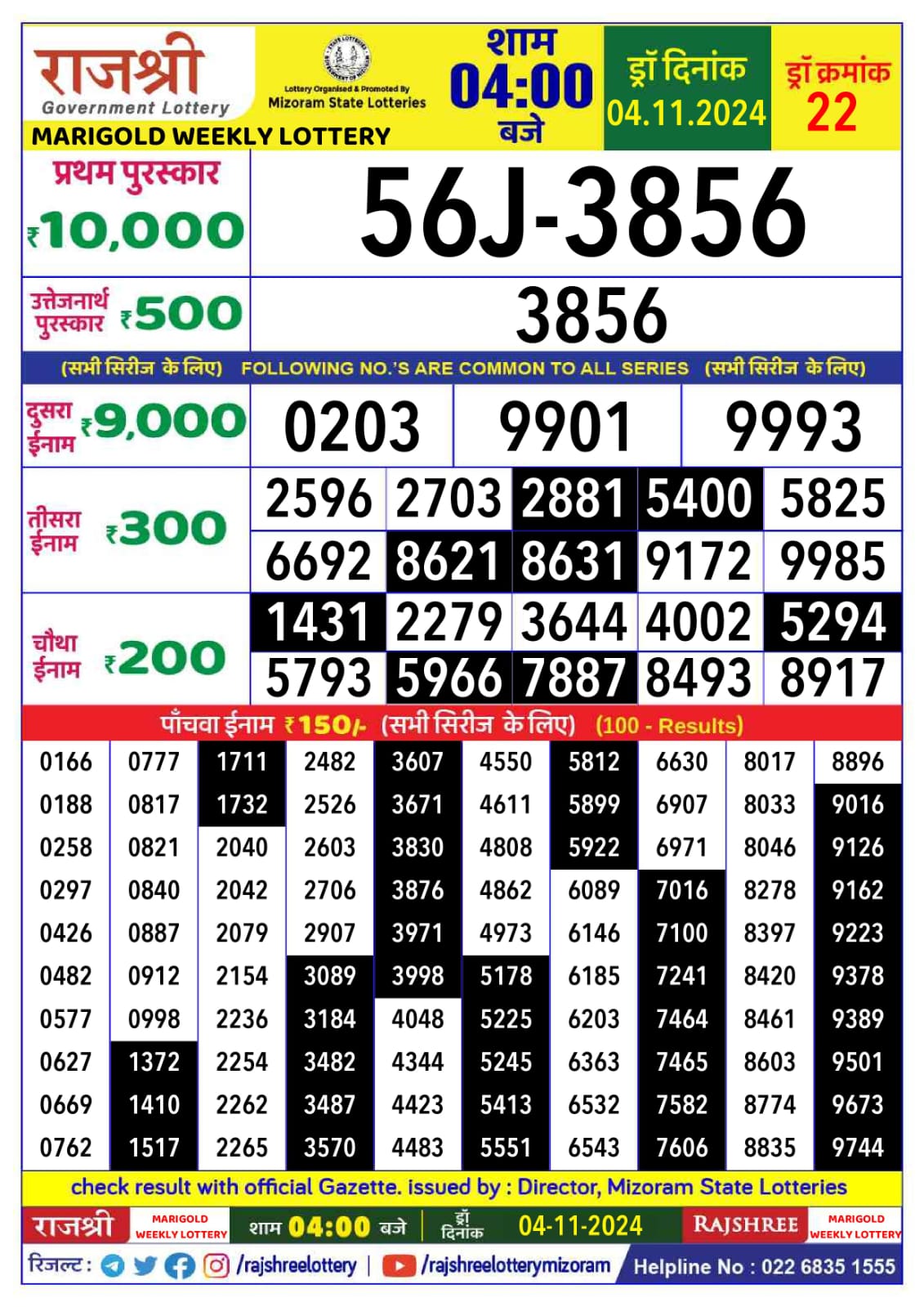 Rajshree marigold monday  Weekly Lottery 4PM Result 4.11.24