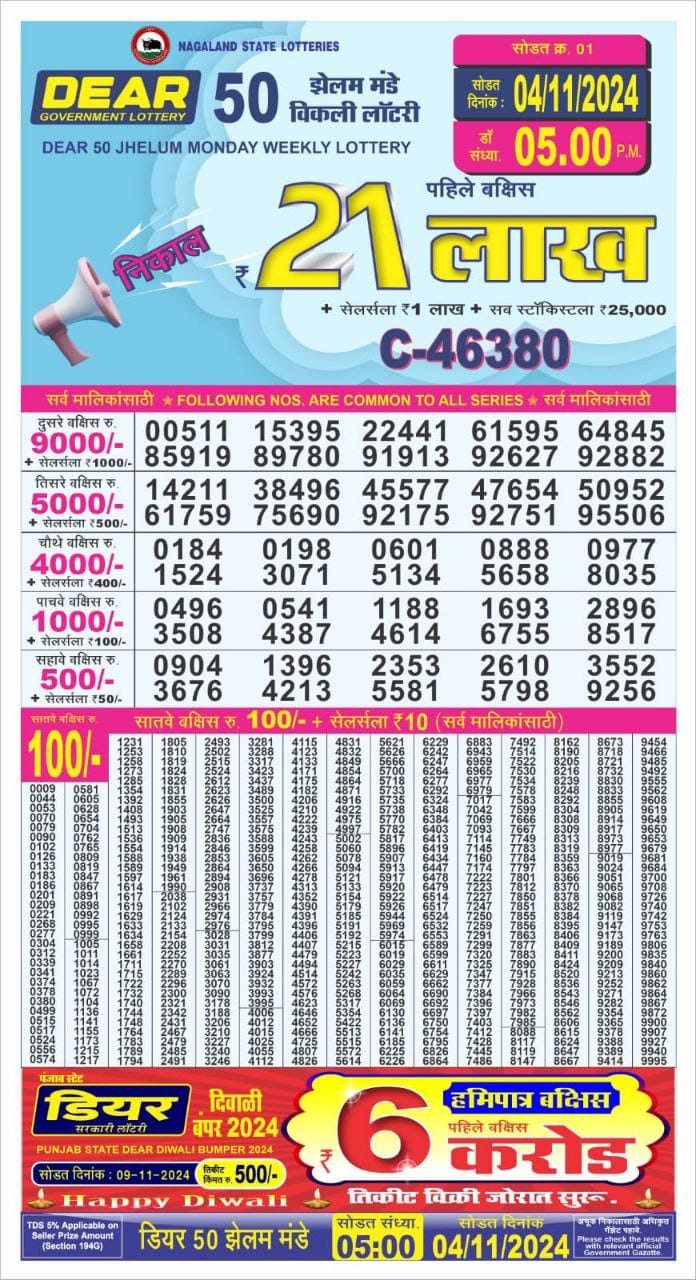 Dear 50 jhelum monday  Lottery 5pm Result  4.11.2024