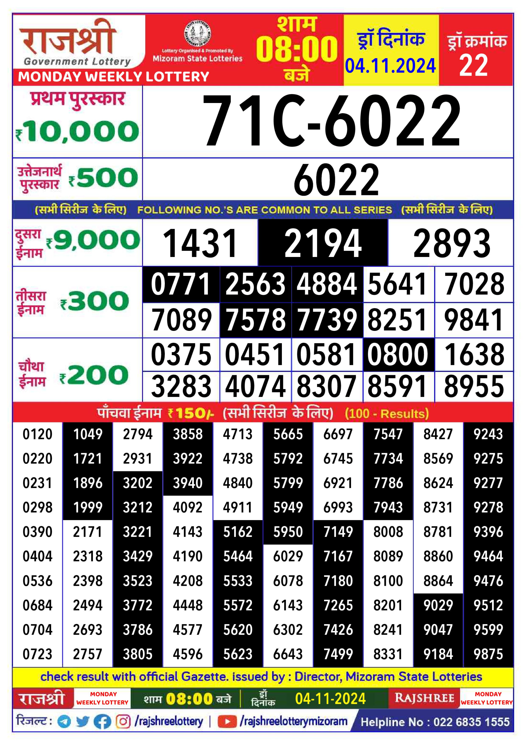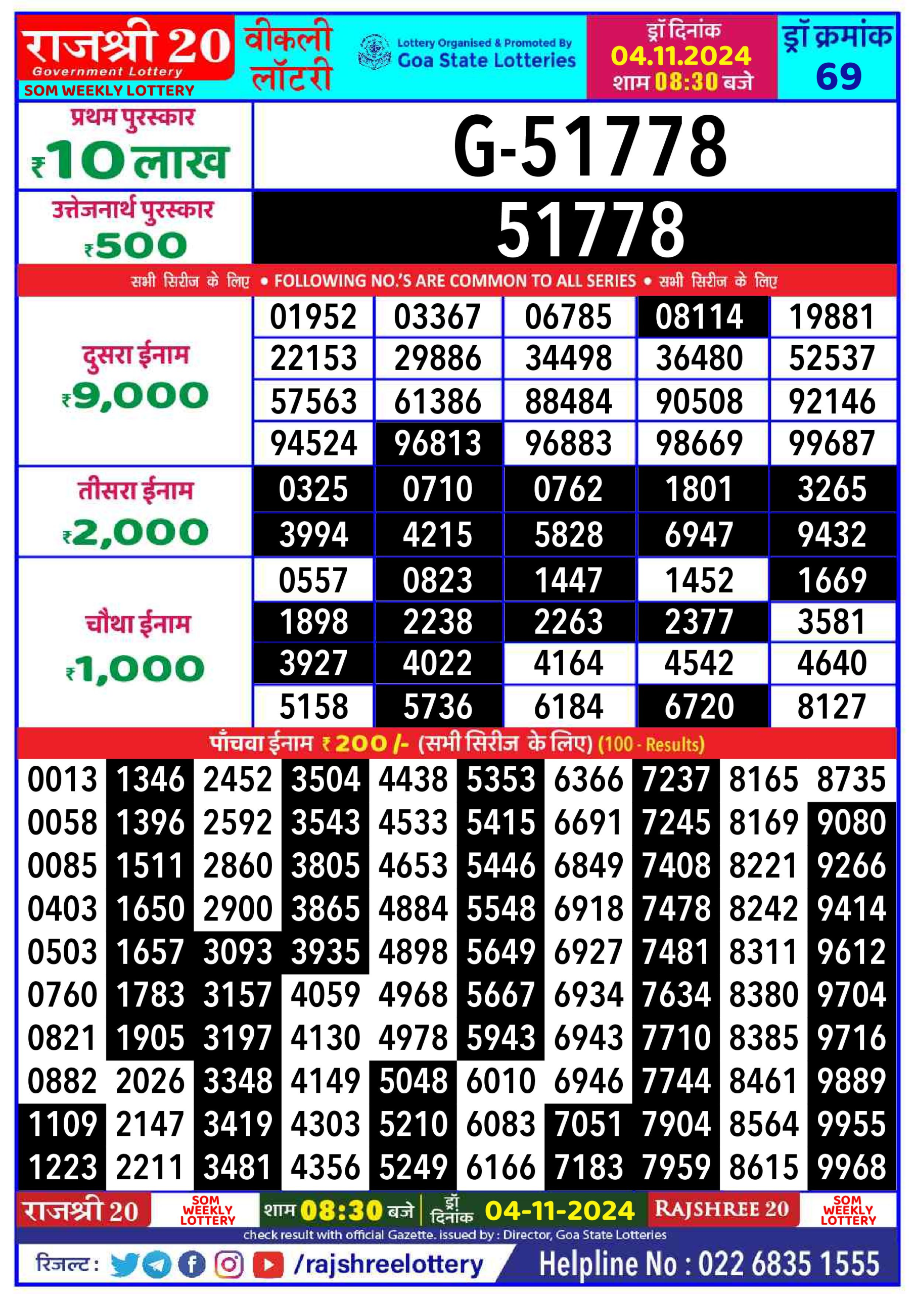 Rajshree 20  weekly 8:30pm Lottery result 4.11.24