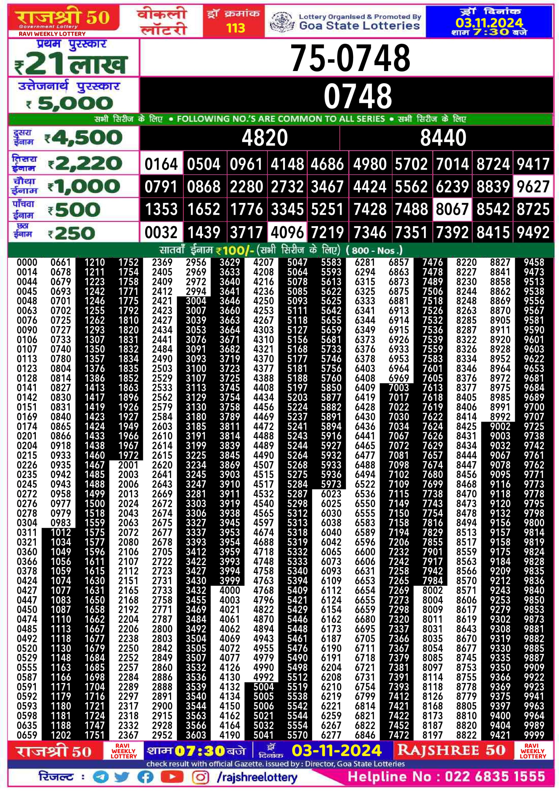 Rajshree 50  Lottery 7:30PM Result 3.11.24