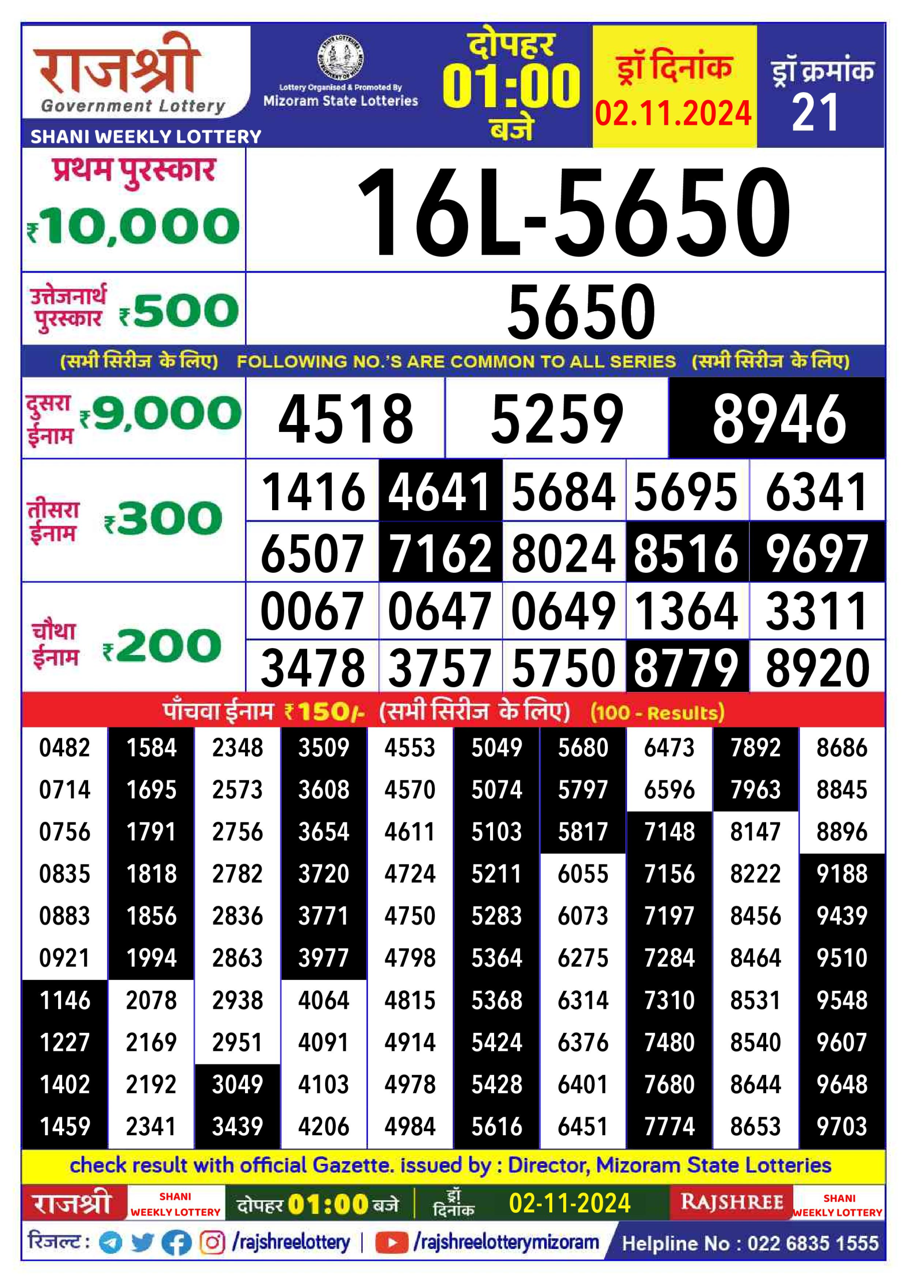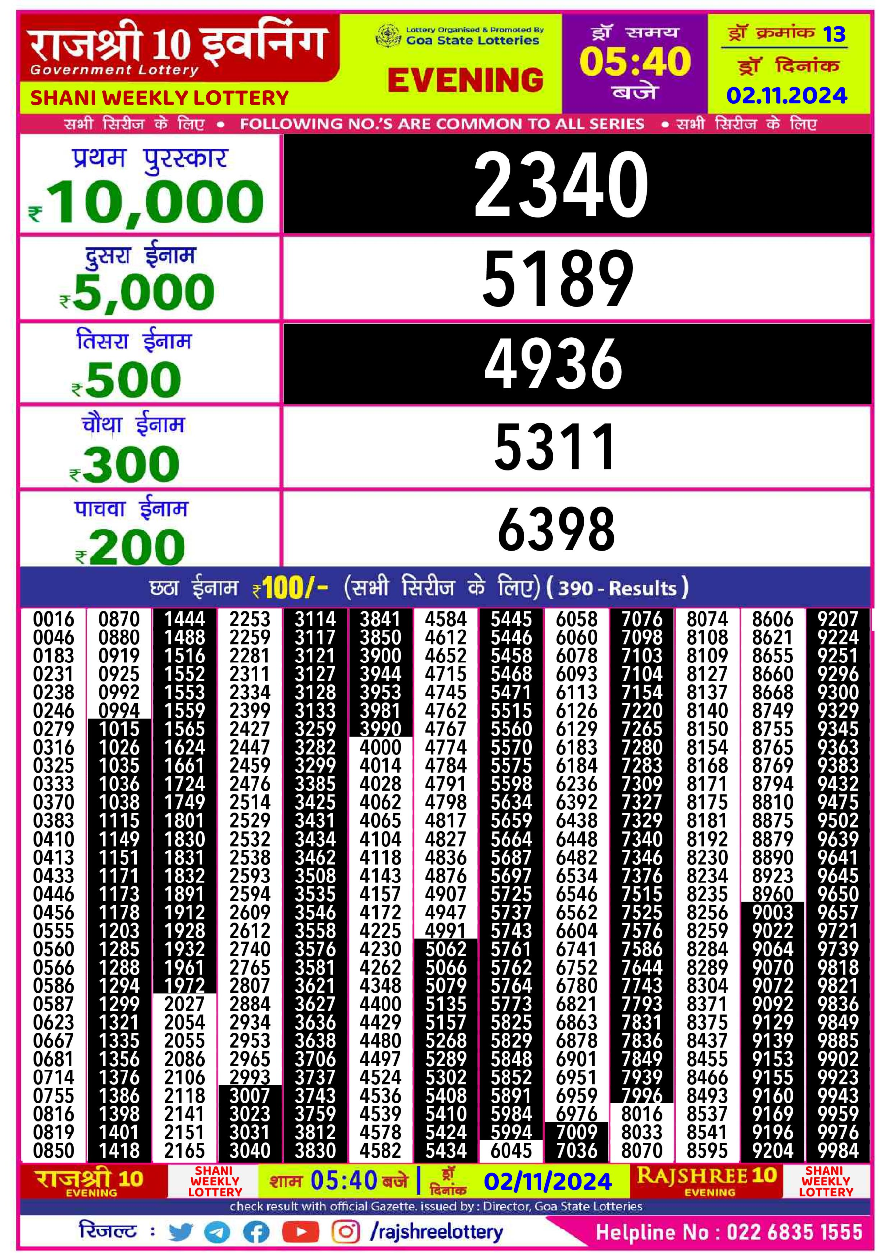 Rajshree shani saturday Weekly Lottery 1PM Result 2.11.24