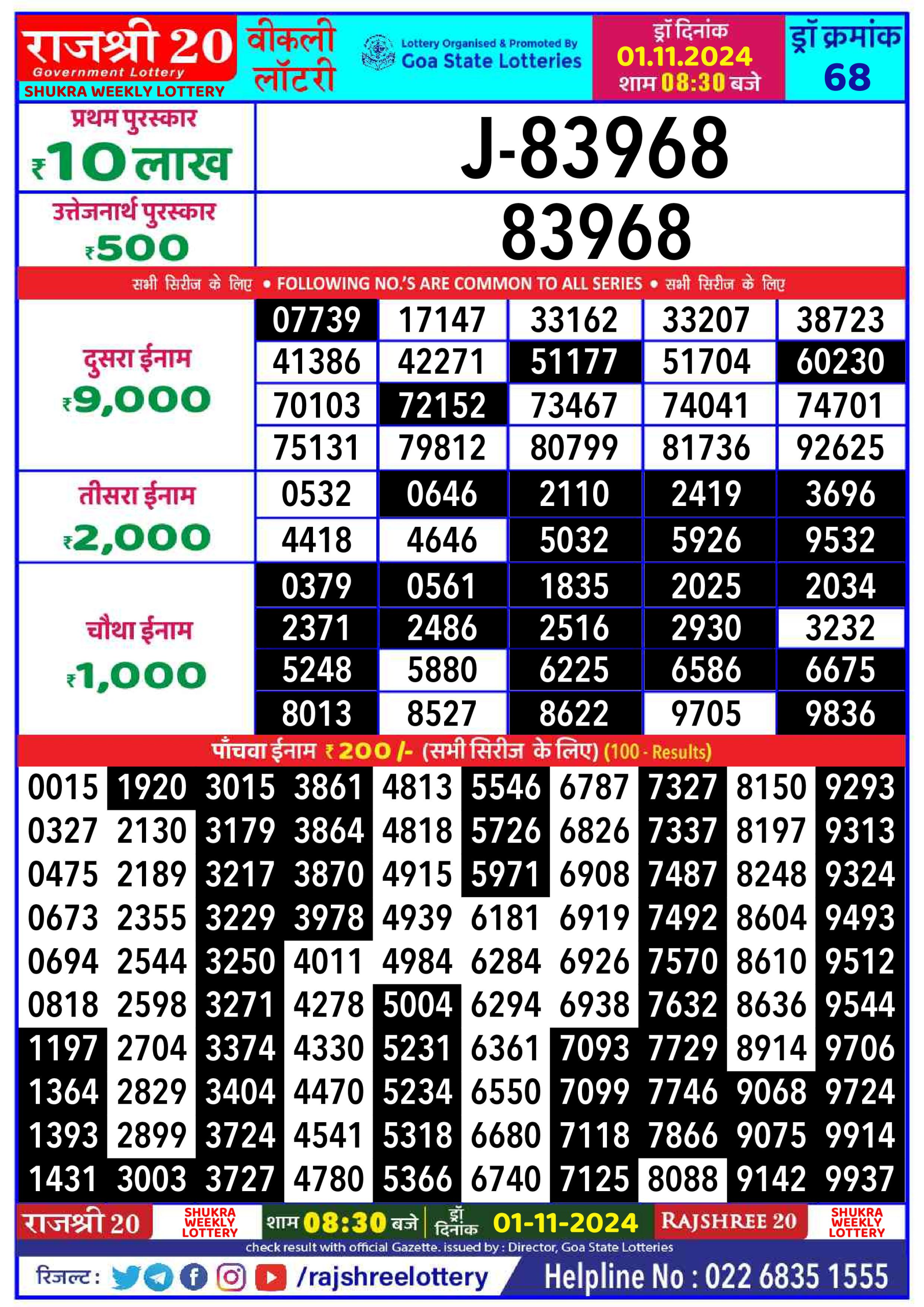 Rajshree 20  weekly 8:30pm Lottery result 1.11.24