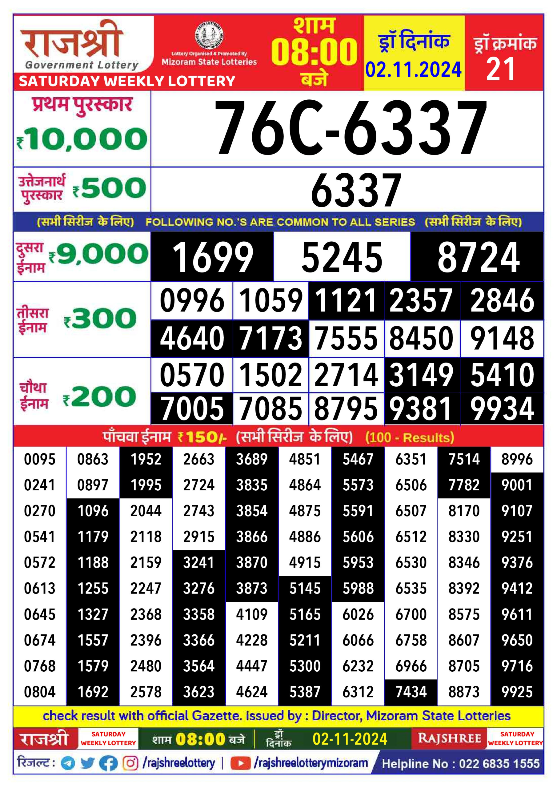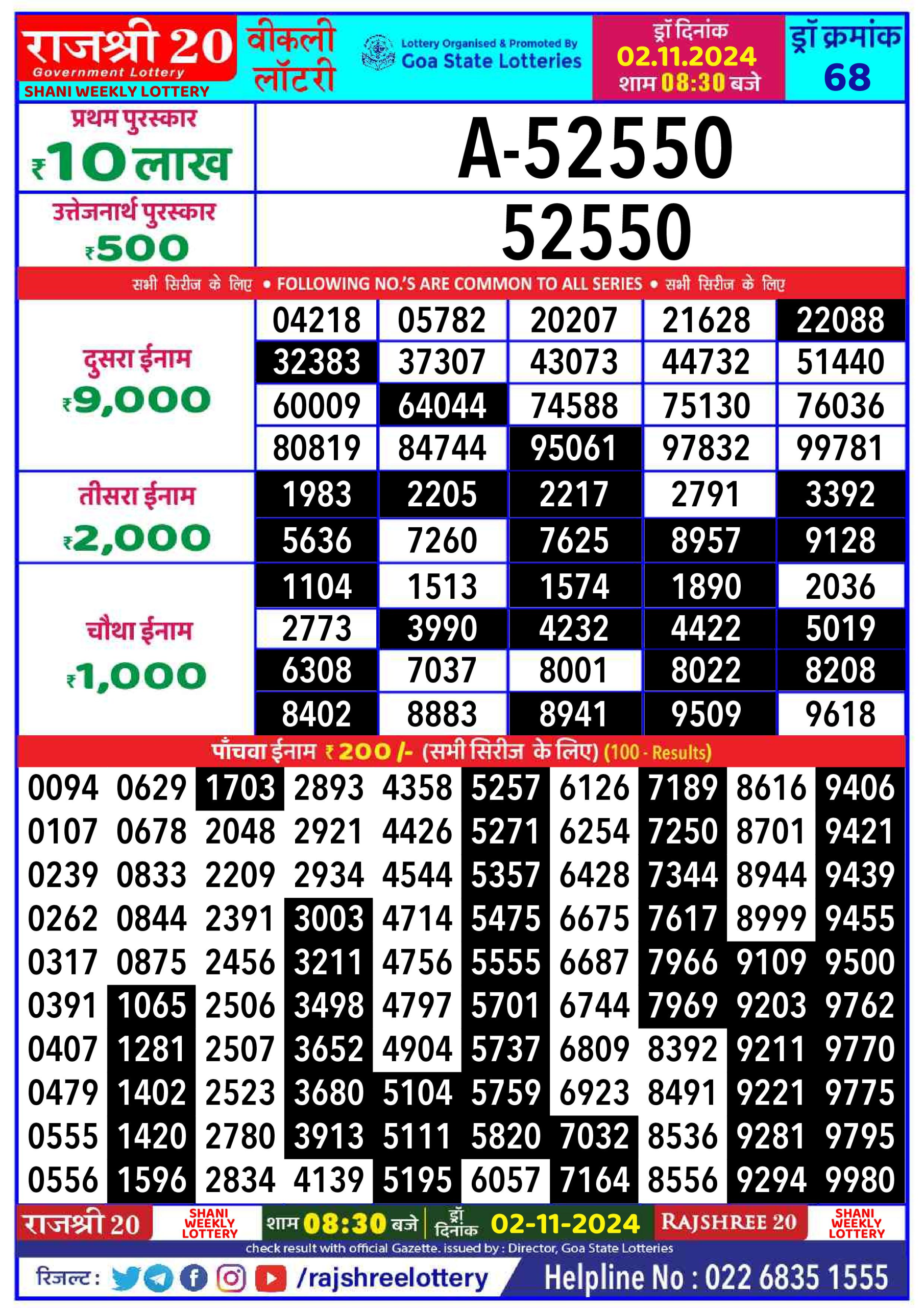 Rajshree 20  weekly 8:30pm Lottery result 2.11.24