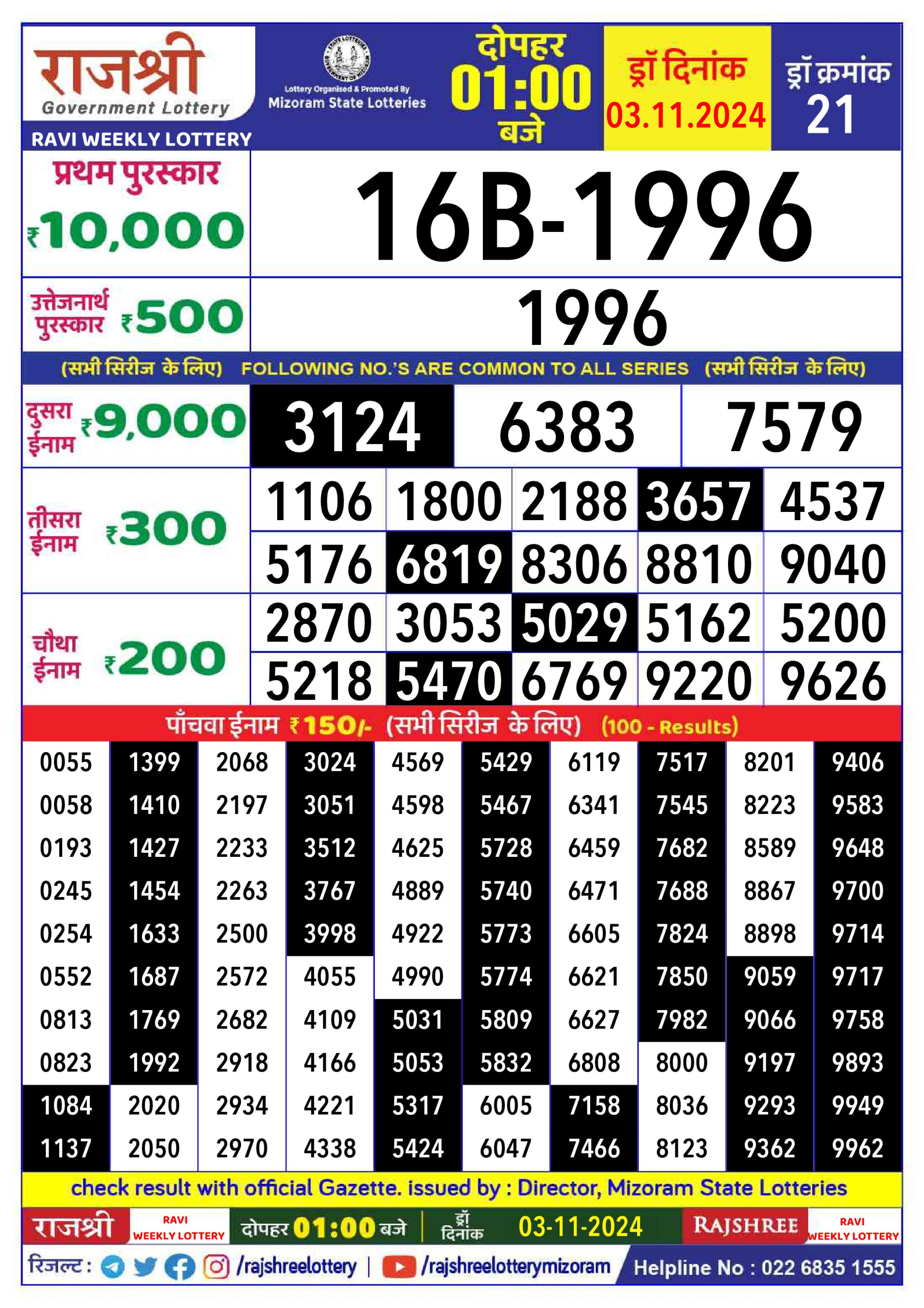Rajshree ravi sunday Weekly Lottery 1PM Result 3.11.24