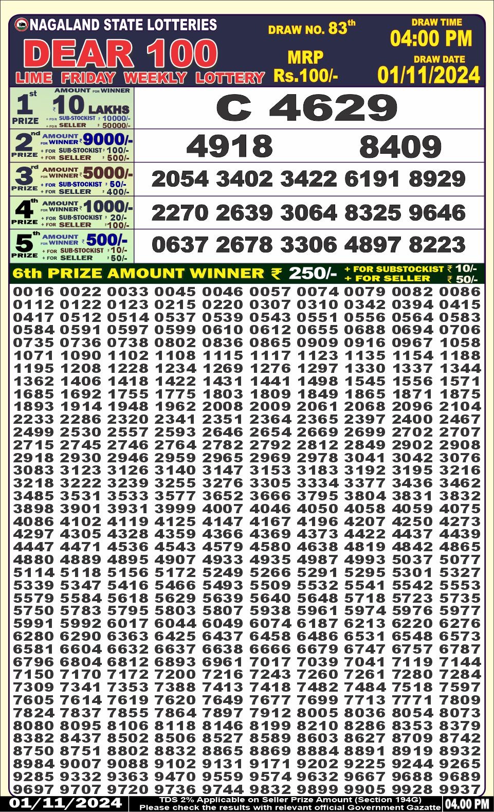 Dear 100 lime friday  Lottery 4pm Result  1.11.2024