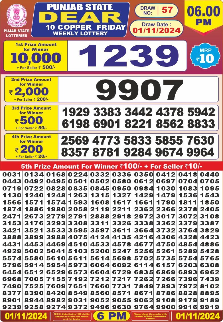 Punjab state dear 10 copper lottery result 1.11.24