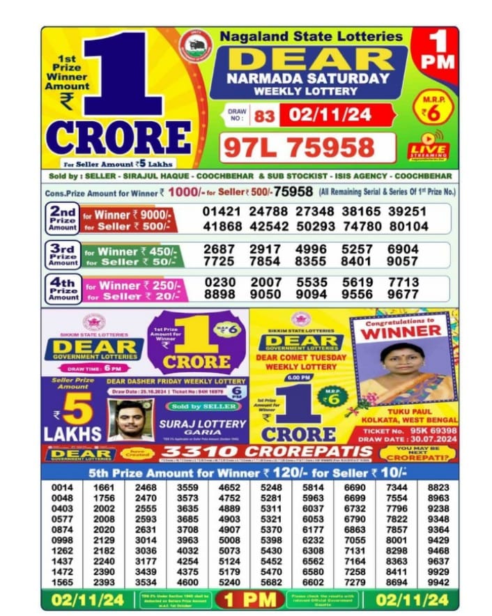 Dear  narmada Weekly 1pm result 2-11-24