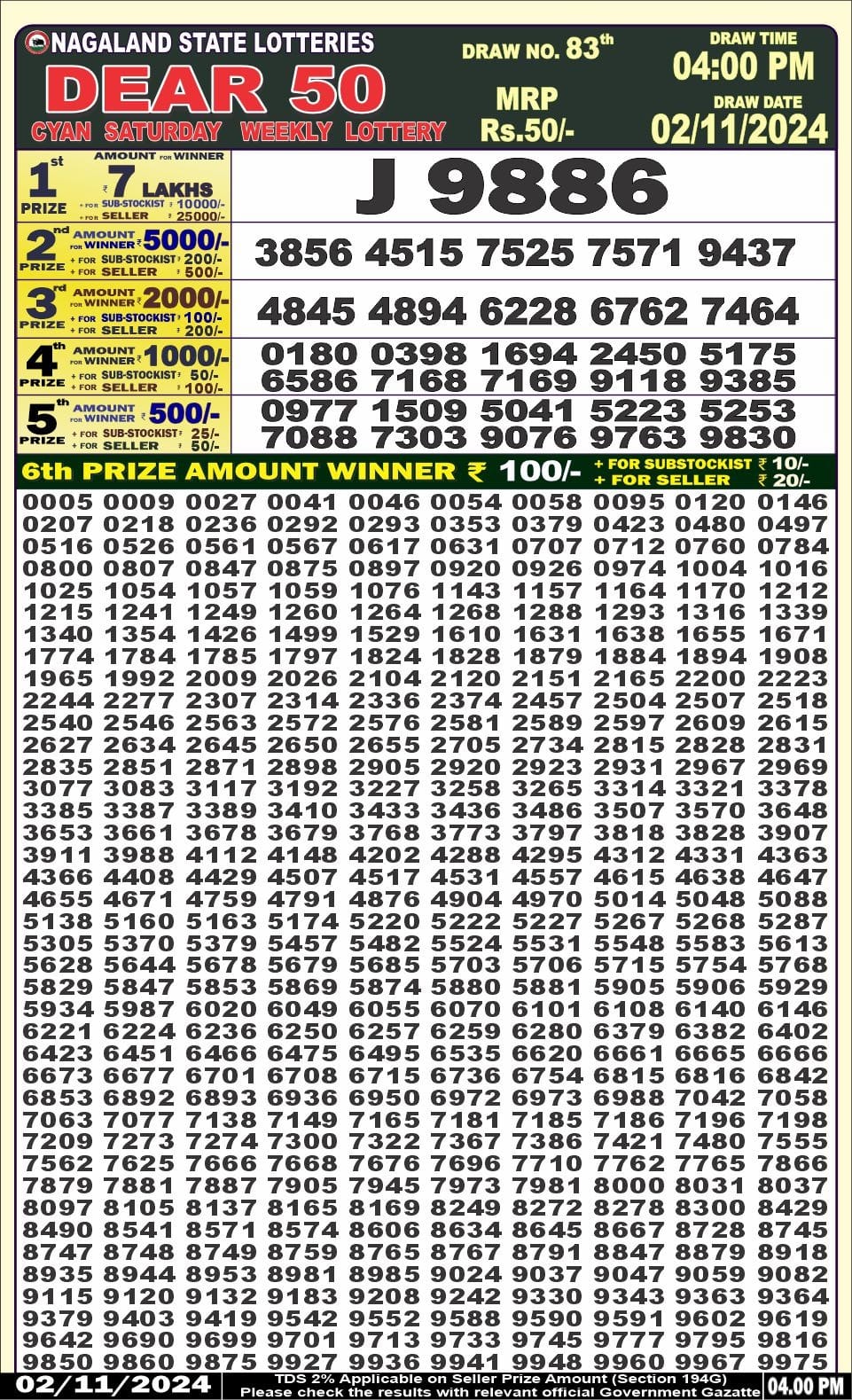 Dear 50 cyan saturday  Lottery 4pm Result  2.11.2024