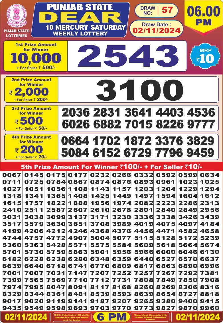 Punjab state dear 10 mercury lottery result 2.11.24