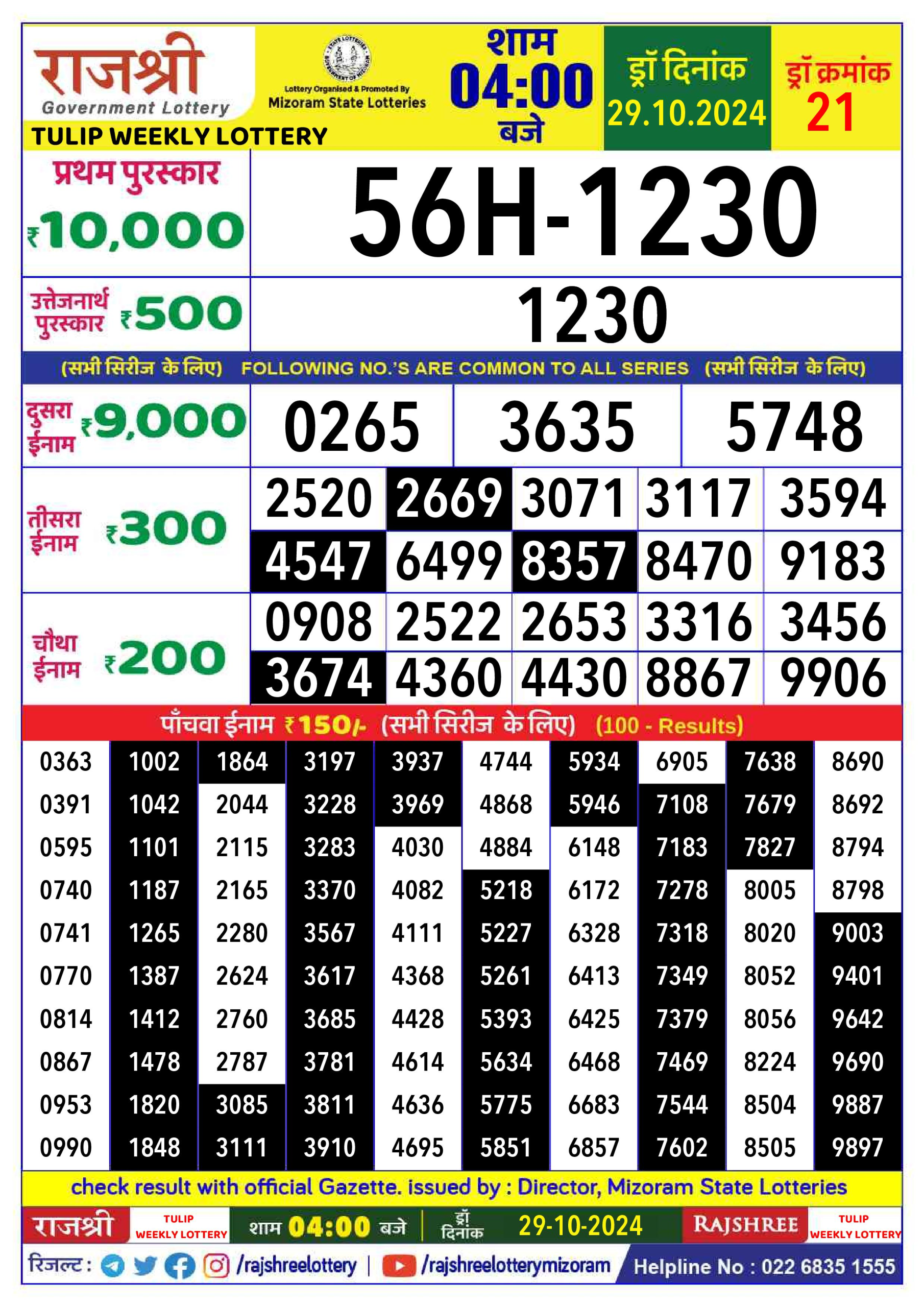 Rajshree tulip tuesday  Weekly Lottery 4PM Result 29.10.24