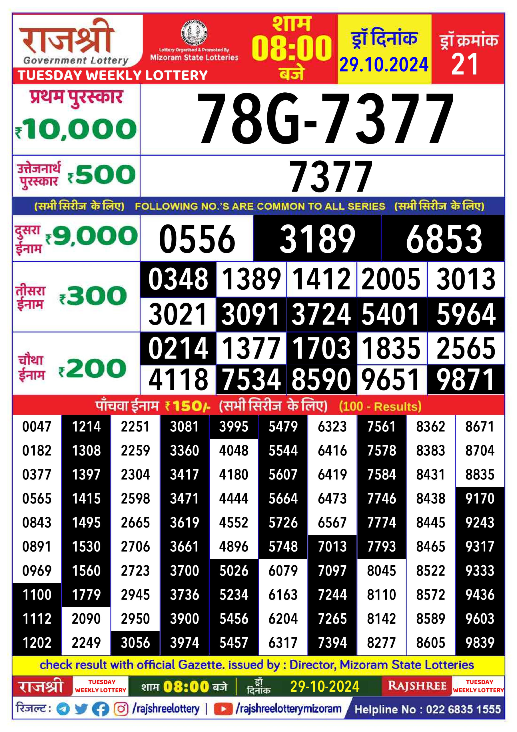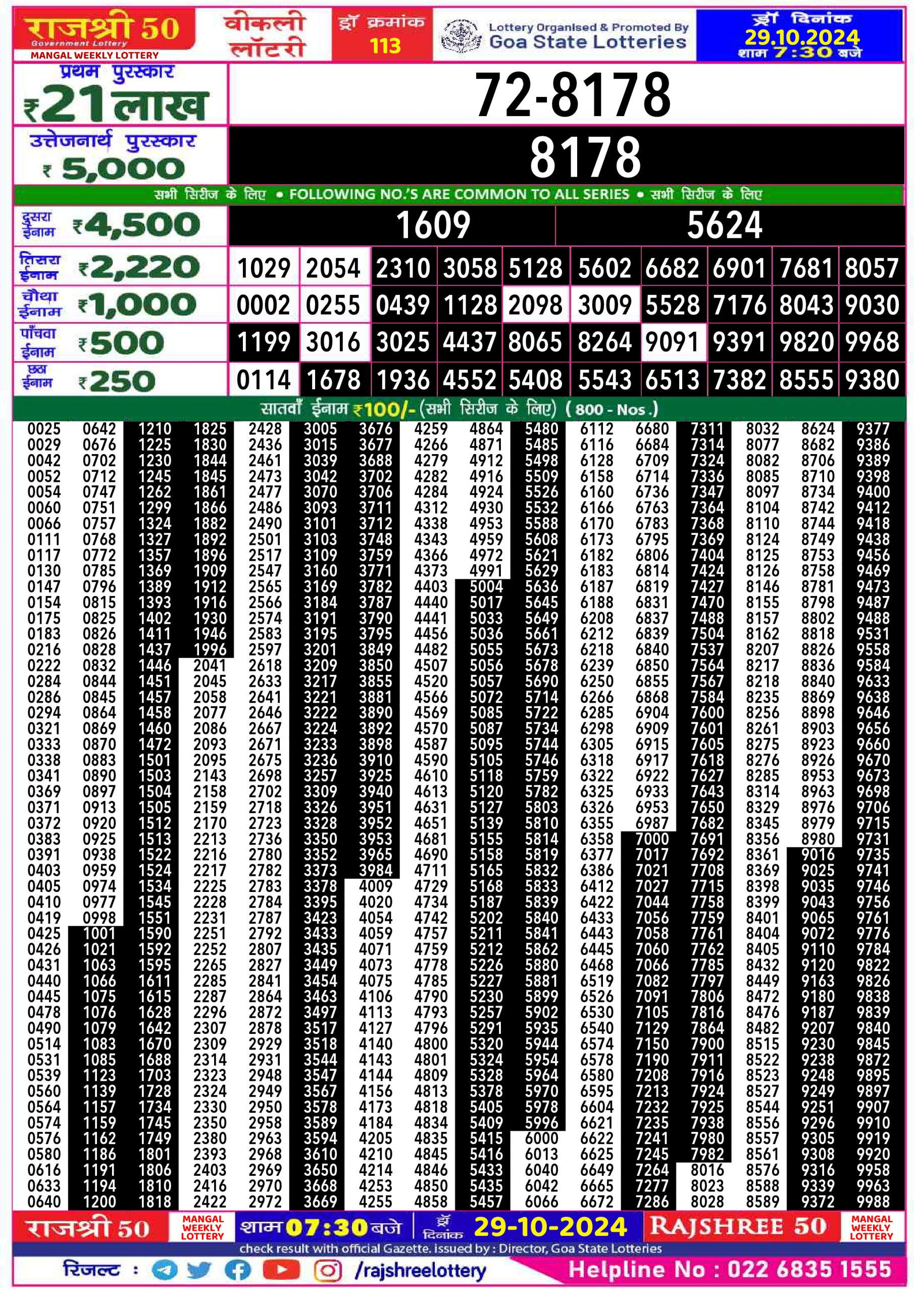 Rajshree 50  Lottery 7:30PM Result 29.10.24