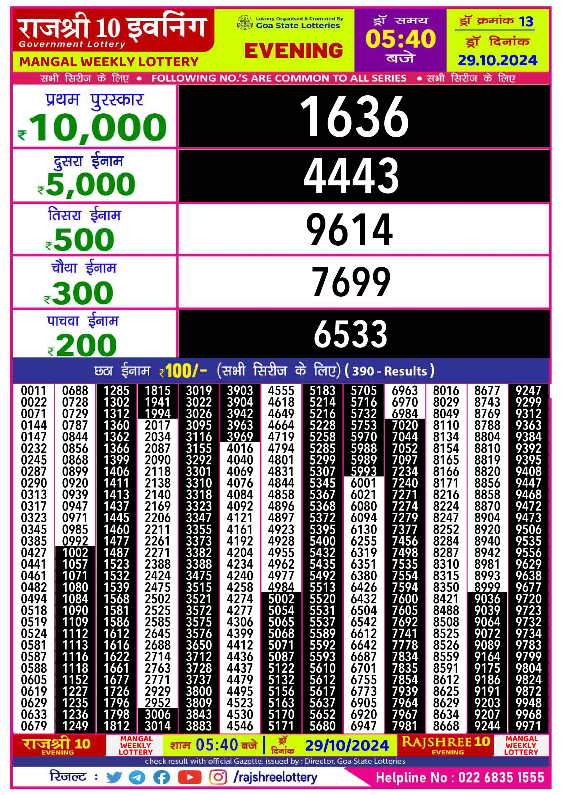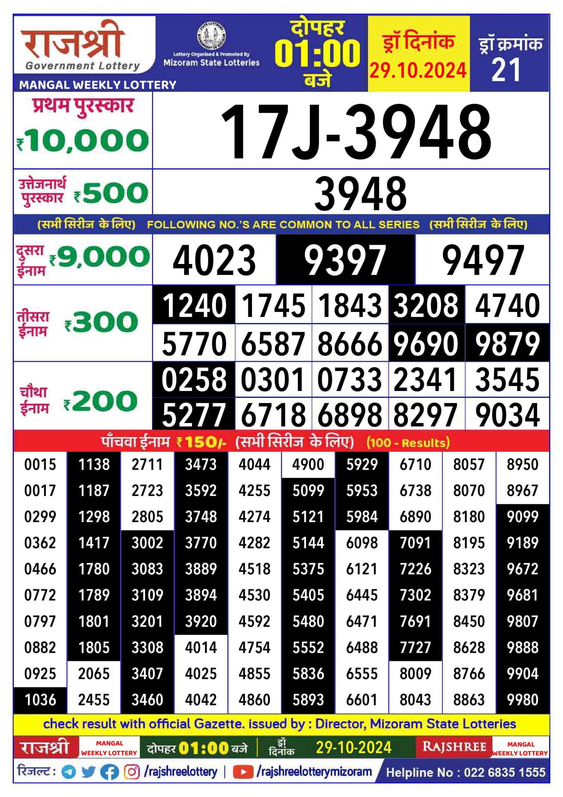 Rajshree Mangal tuesday Weekly Lottery 1PM Result 29.10.24
