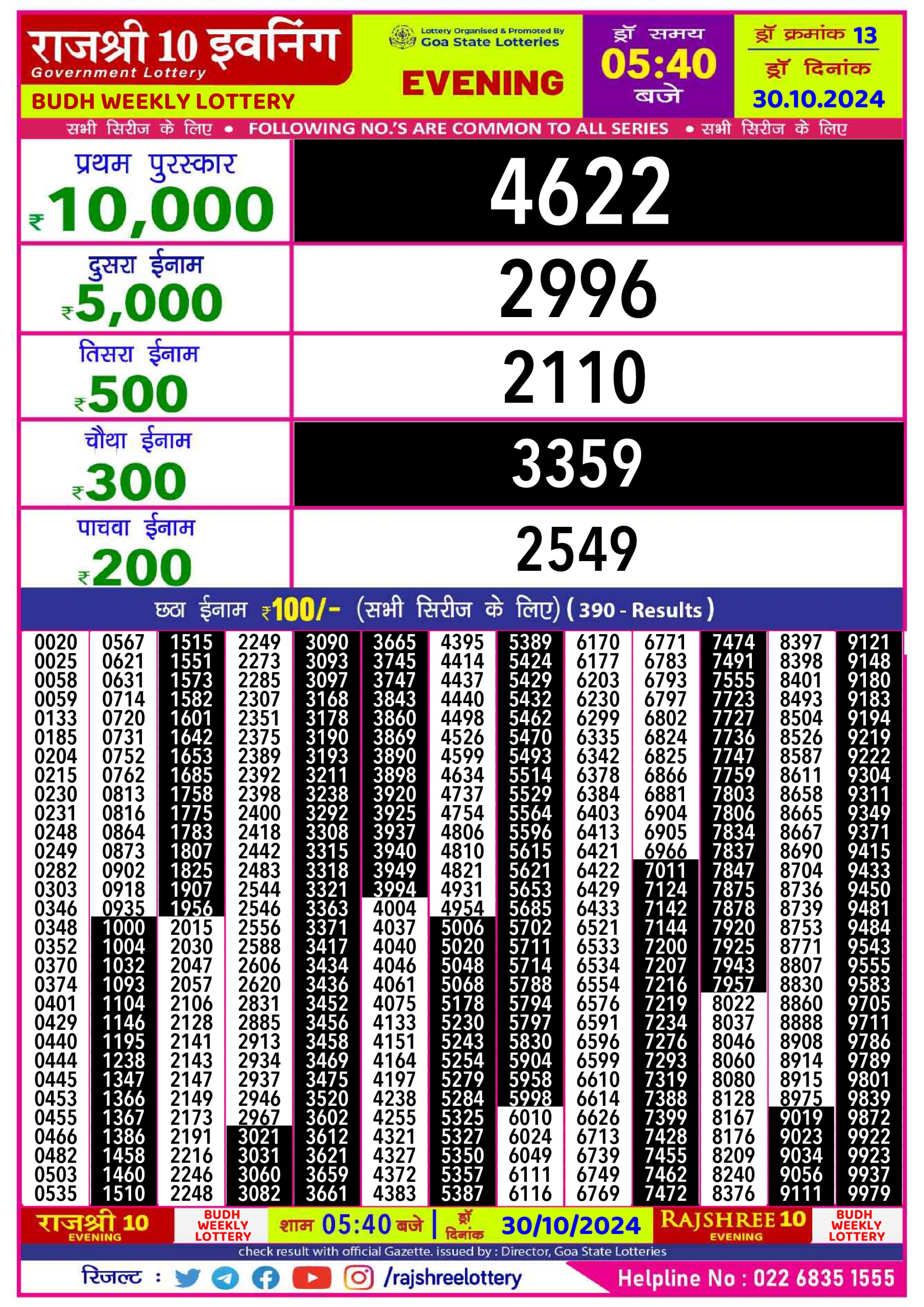Rajshree budh wednesday Weekly Lottery 1PM Result 30.10.24