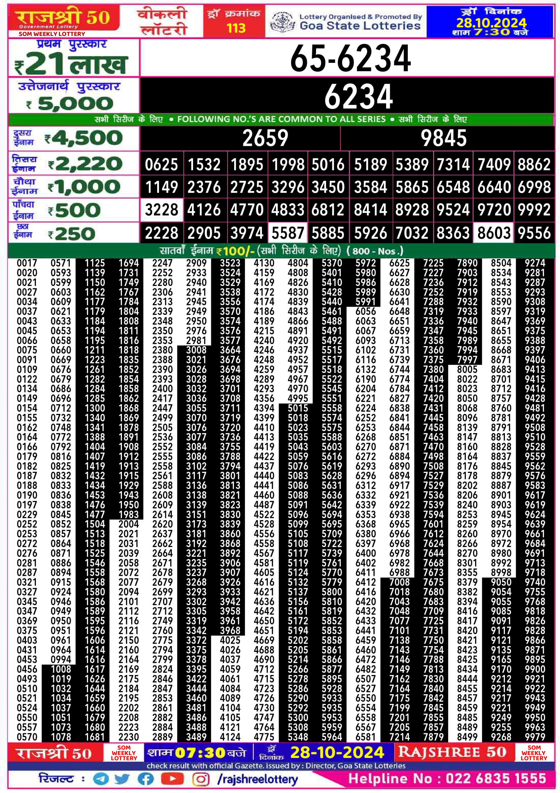 Rajshree 50  Lottery 7:30PM Result 28.10.24