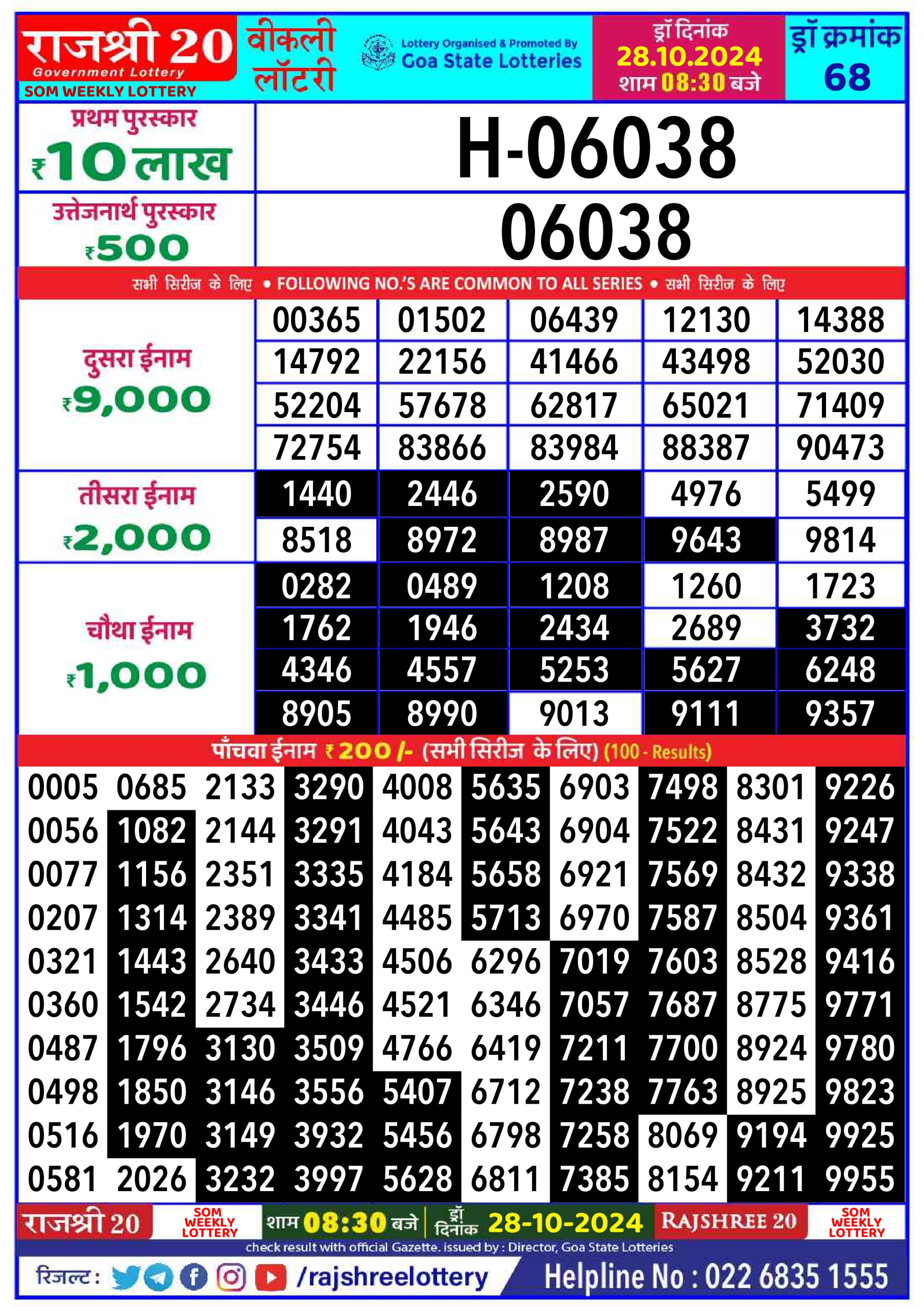 Rajshree 20  weekly 8:30pm Lottery result 28.10.24