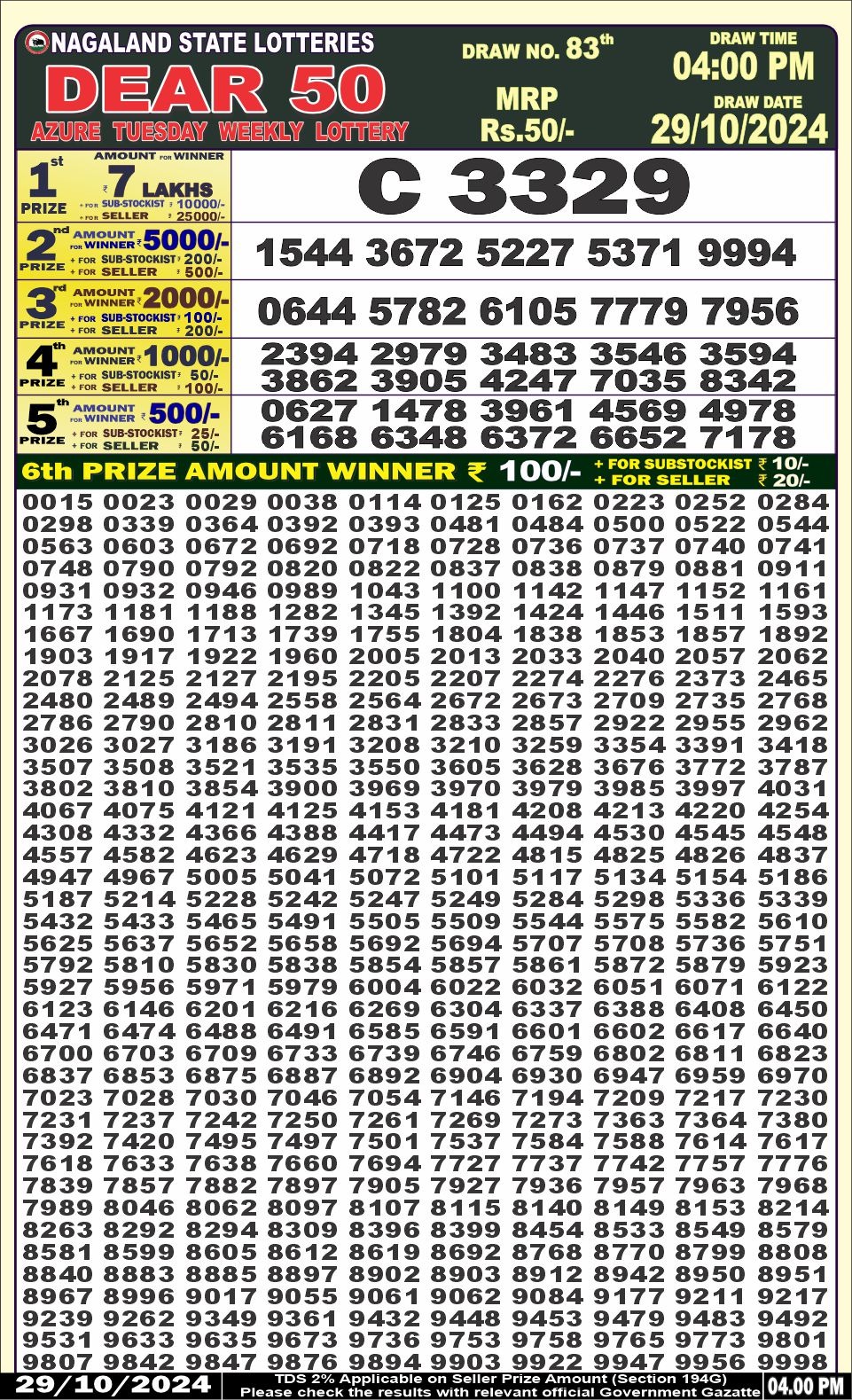 Dear 50 azure tuesday  Lottery 4pm Result  29.10.2024