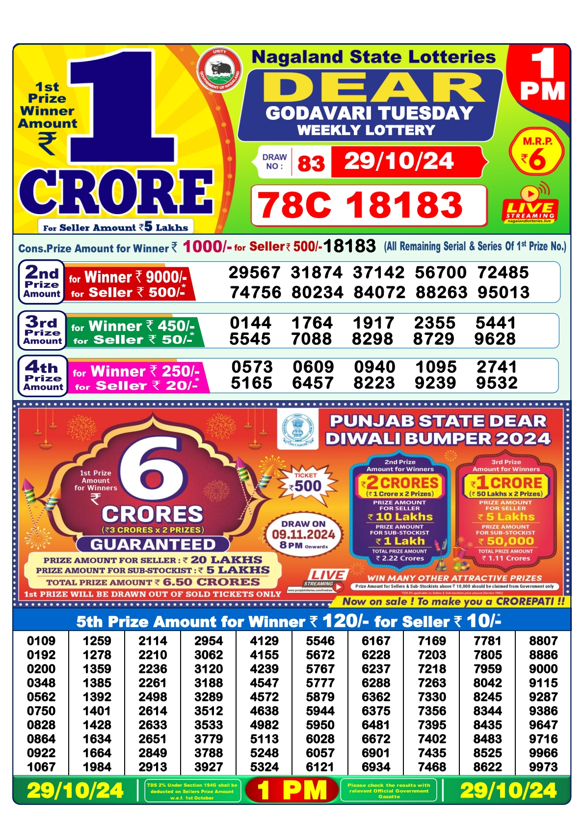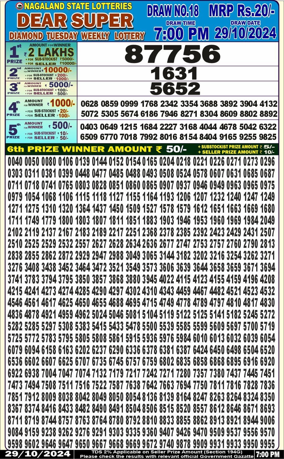 Dear super diamond 7pm lottery result 29.10.24