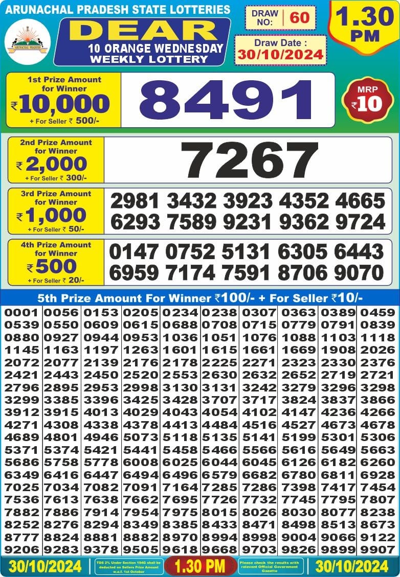 Dear 10 orange lottery 1.30PM Result 30/10/24
