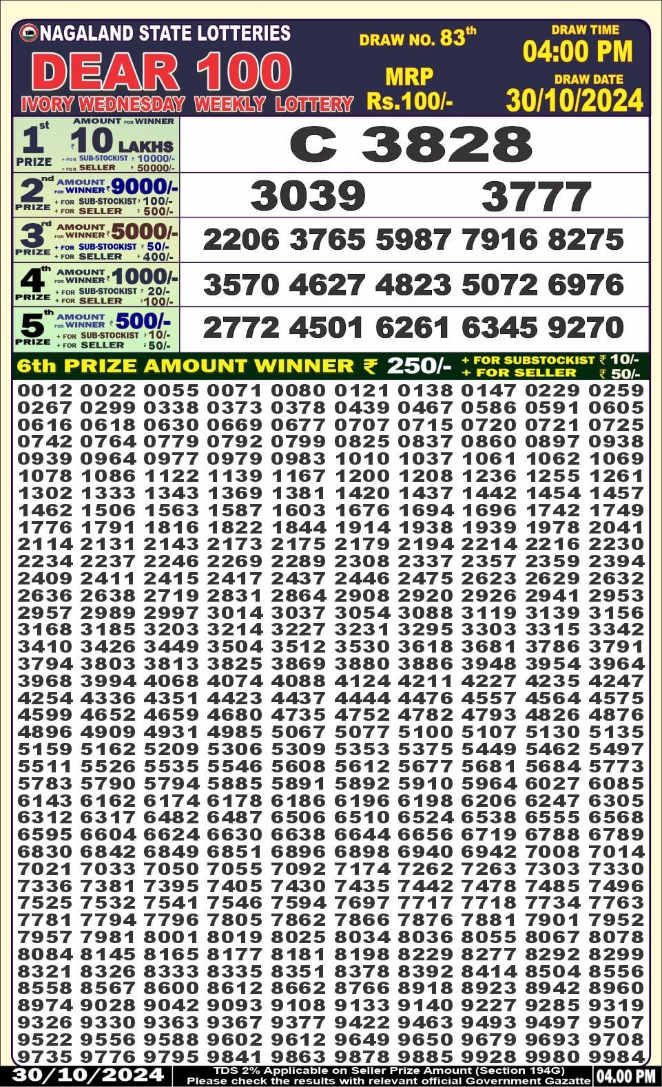 Dear 100 ivory wednesday  Lottery 4pm Result  30.10.2024