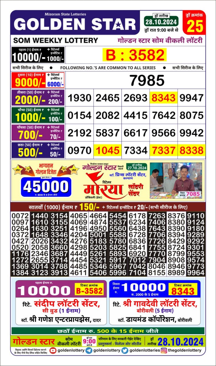 Golden Star  weekly Lottery result 28.10.24