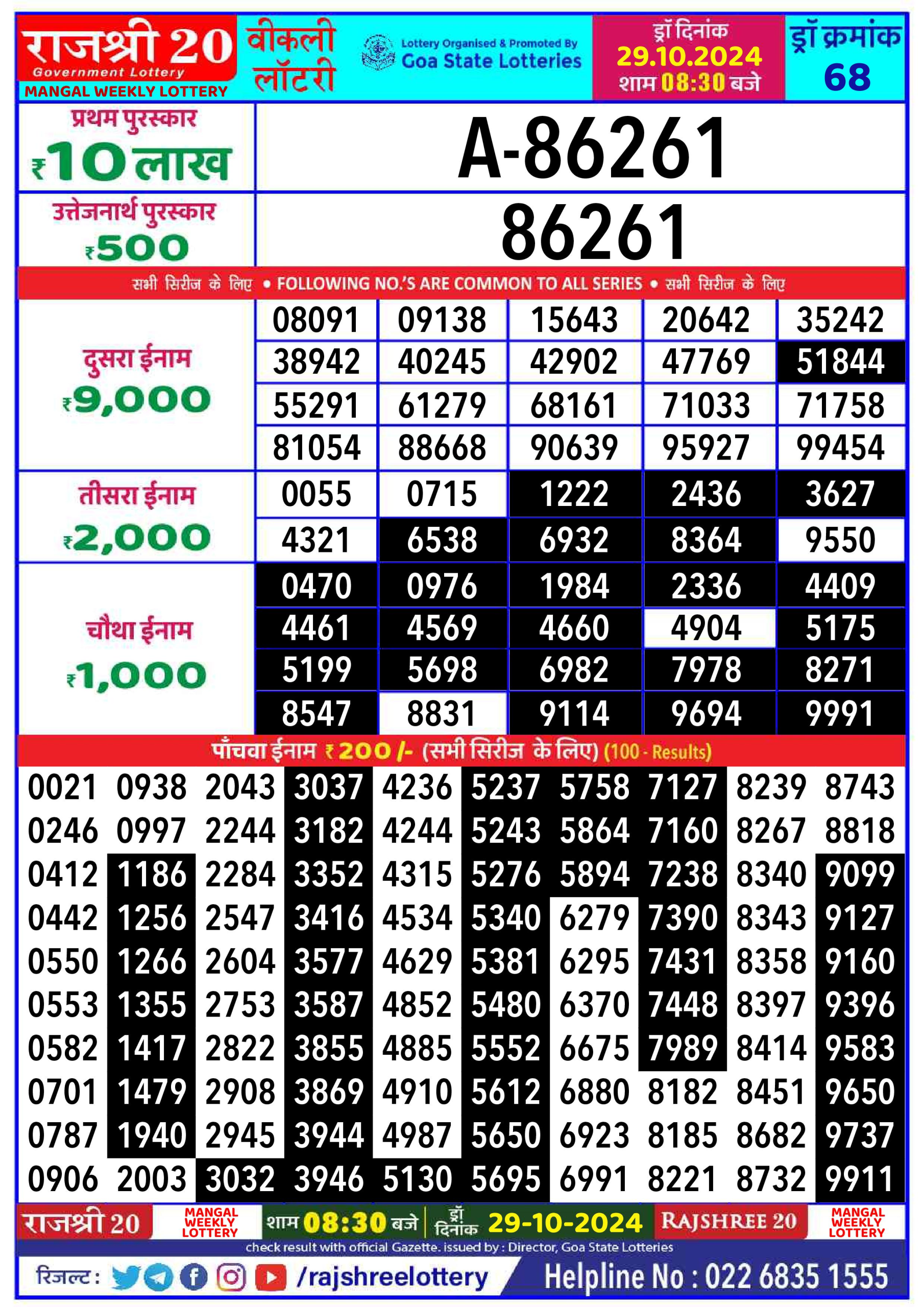 Rajshree 20  weekly 8:30pm Lottery result 29.10.24